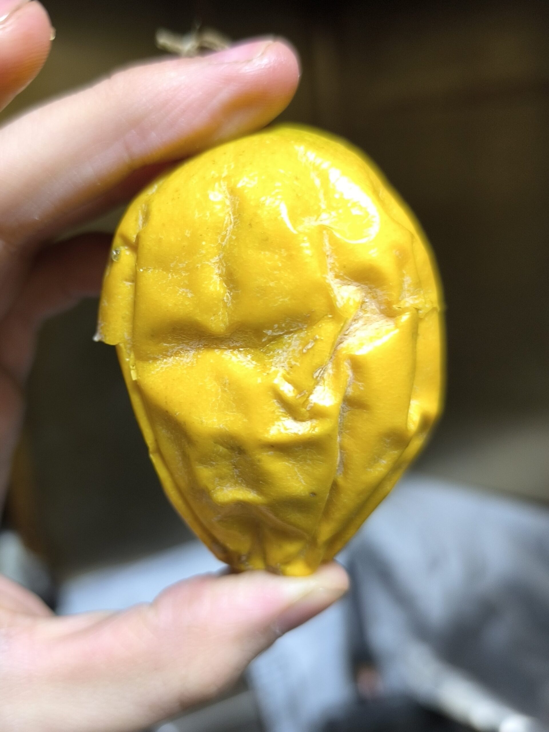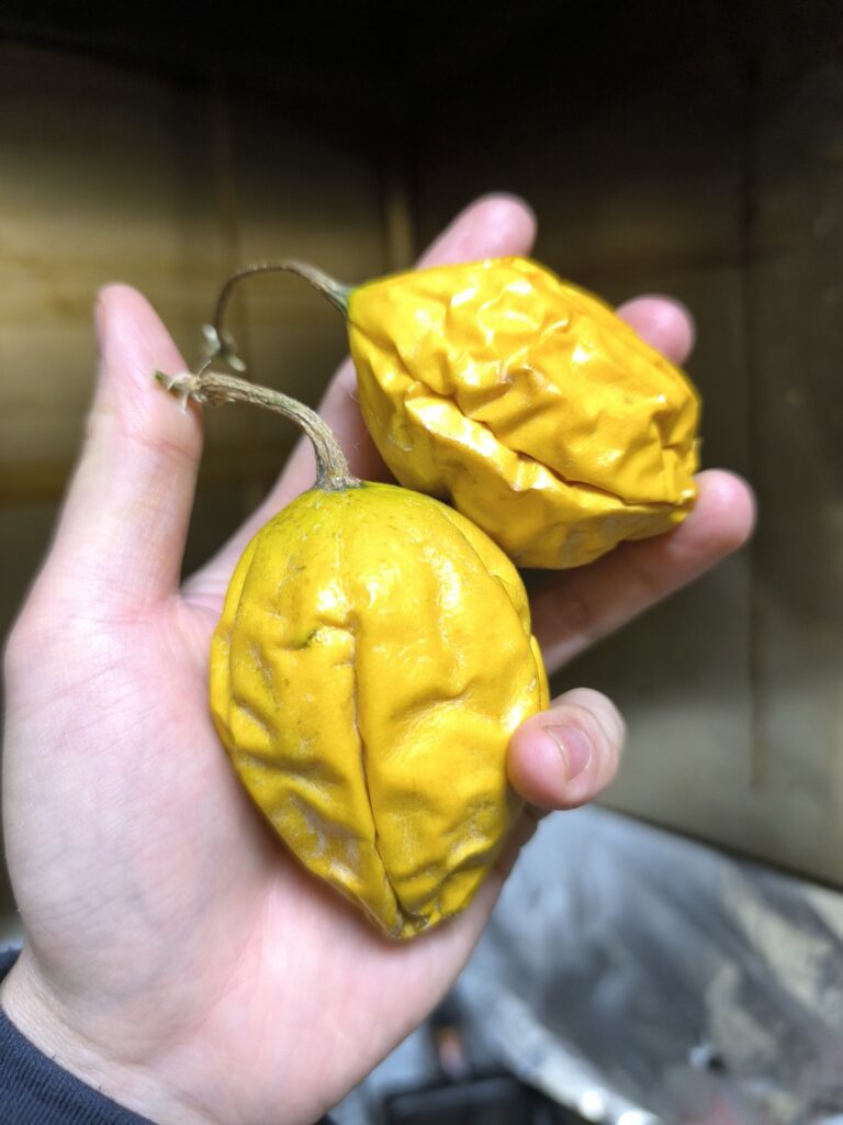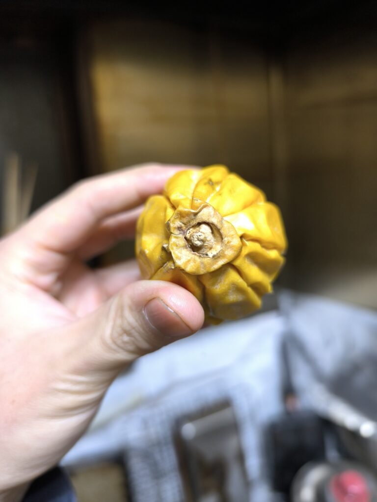 それを1月27日まで約1カ月追熟させてみた。ご覧のとおりできちんと追熟して黄色くなっている。ちなみに1週間まえからもう黄色くなってきていたので、最大肥大期を過ぎた果実なら1カ月くらいで追熟が完了するのかもしれない。