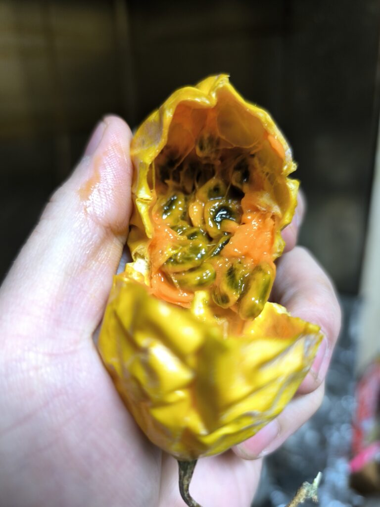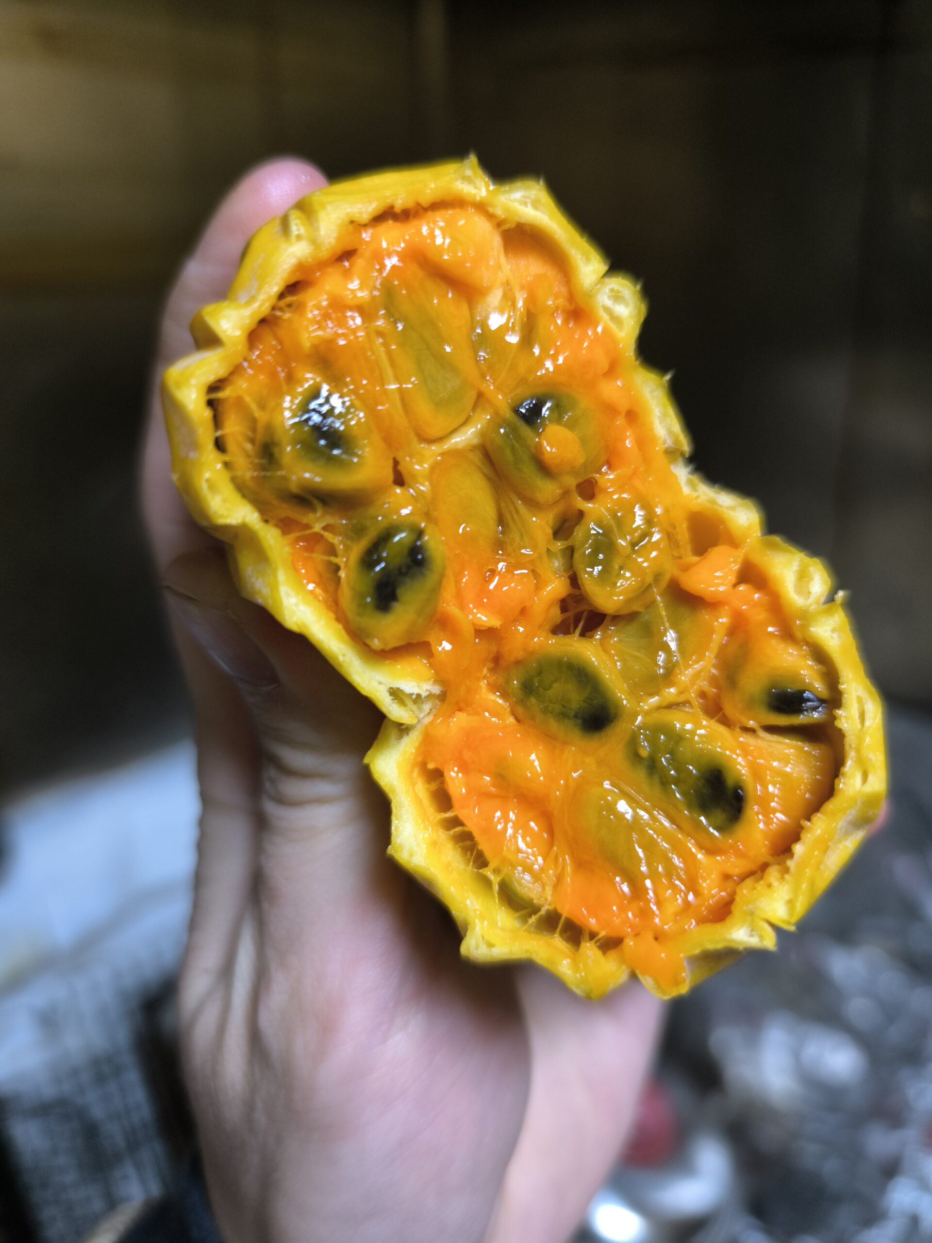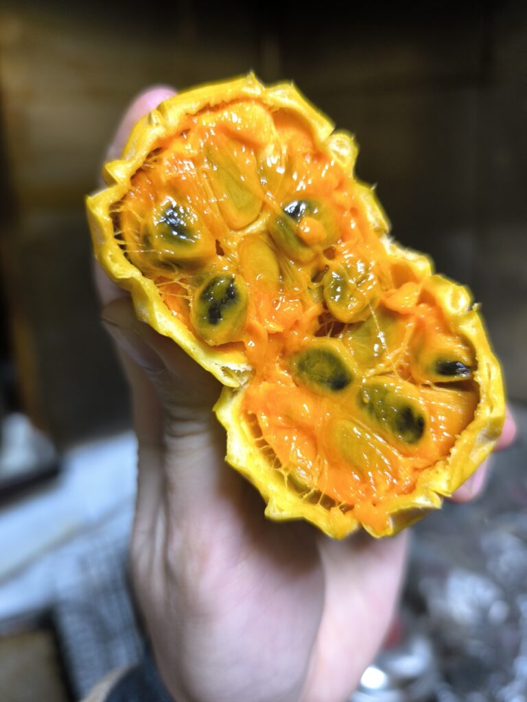 キカラスウリは12月の未熟果を1カ月追熟したら上品な香りで糖度30の激甘果実になった。