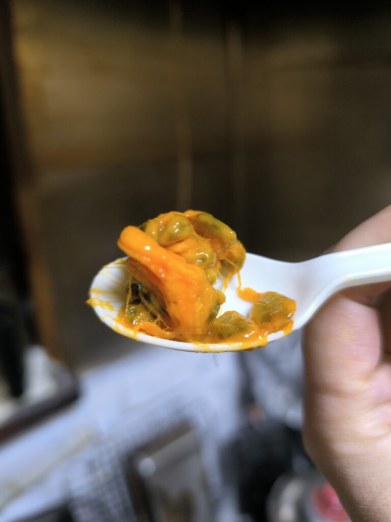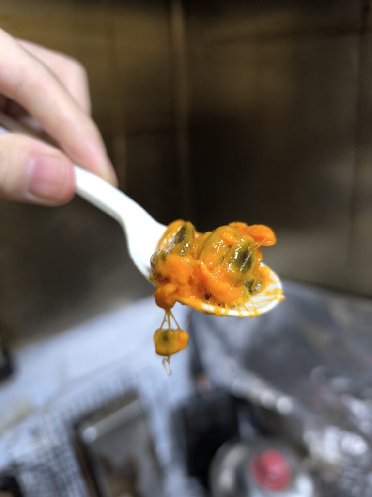食感はムベに近いが、カボチャの胎座のような繊維質もある。