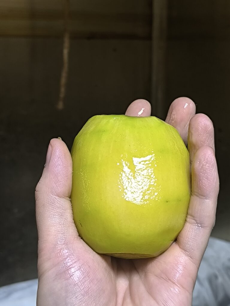 断面はむしろゴールドキウイのセンセーションアップルのような色と横平な形。