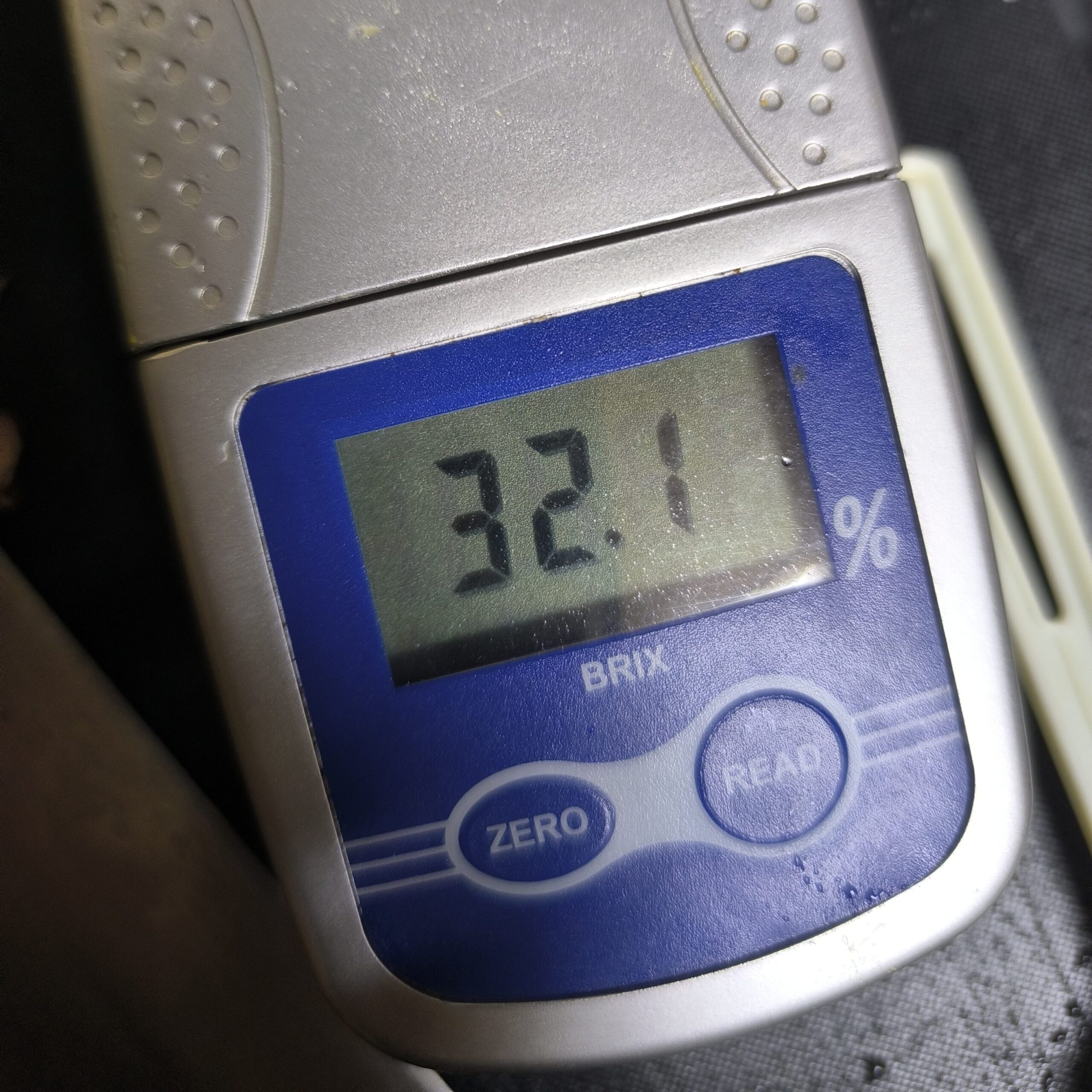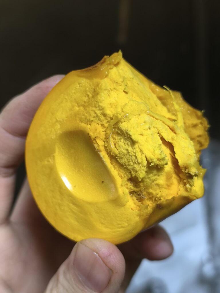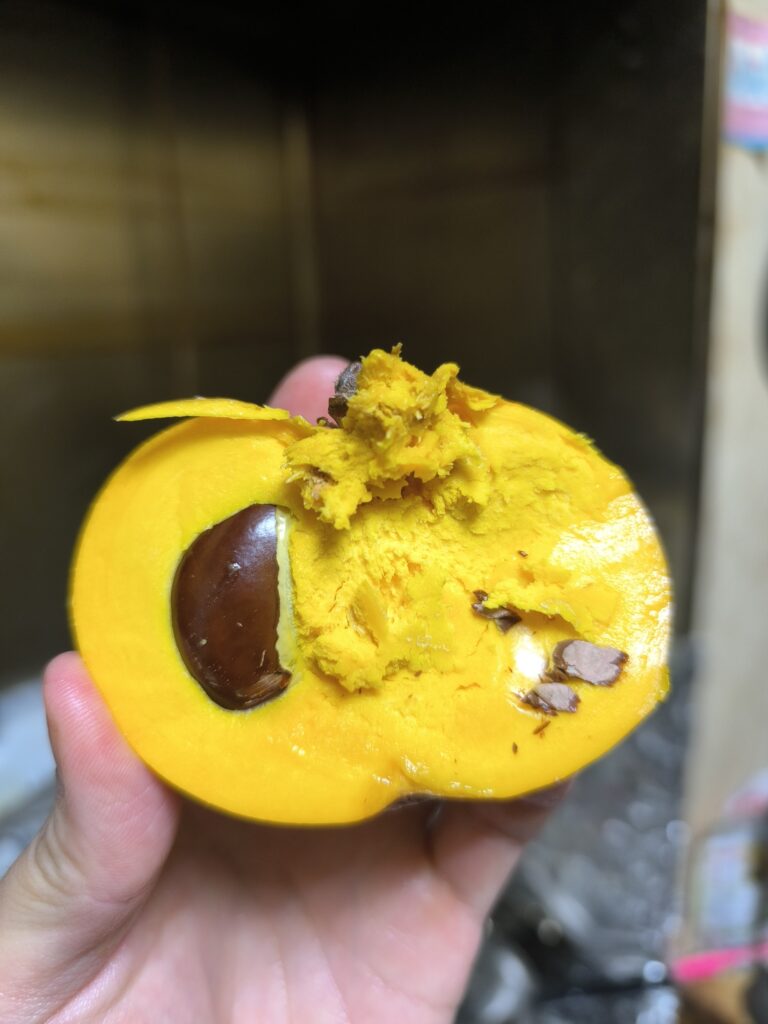 糖度を測るとこうなる。糖度計はデンプンも計測してしまうためバナナやカボチャなどデンプン蓄積型の果実を測るととんでもない数字が出る。カニステルの仲間もまたデンプン蓄積型なので糖度計の数値はあまり当てにならない。