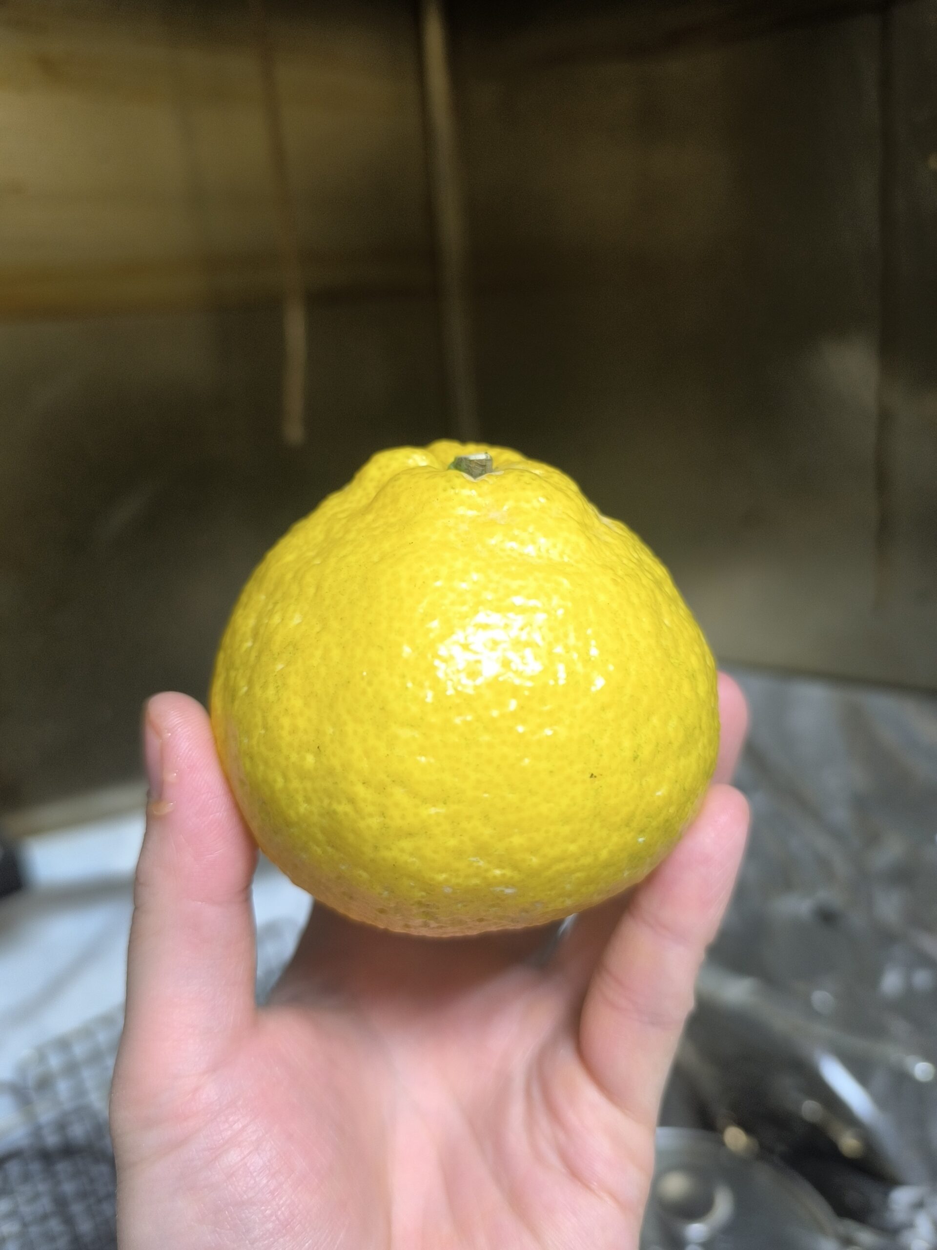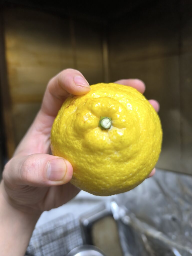 デコポンみたいなデコがあり黄色い果皮が眩しい。日向夏由来の美しい黄色に夏橙のようなゴワゴワした質感の分厚い果皮があり、中々輸送に強そう。