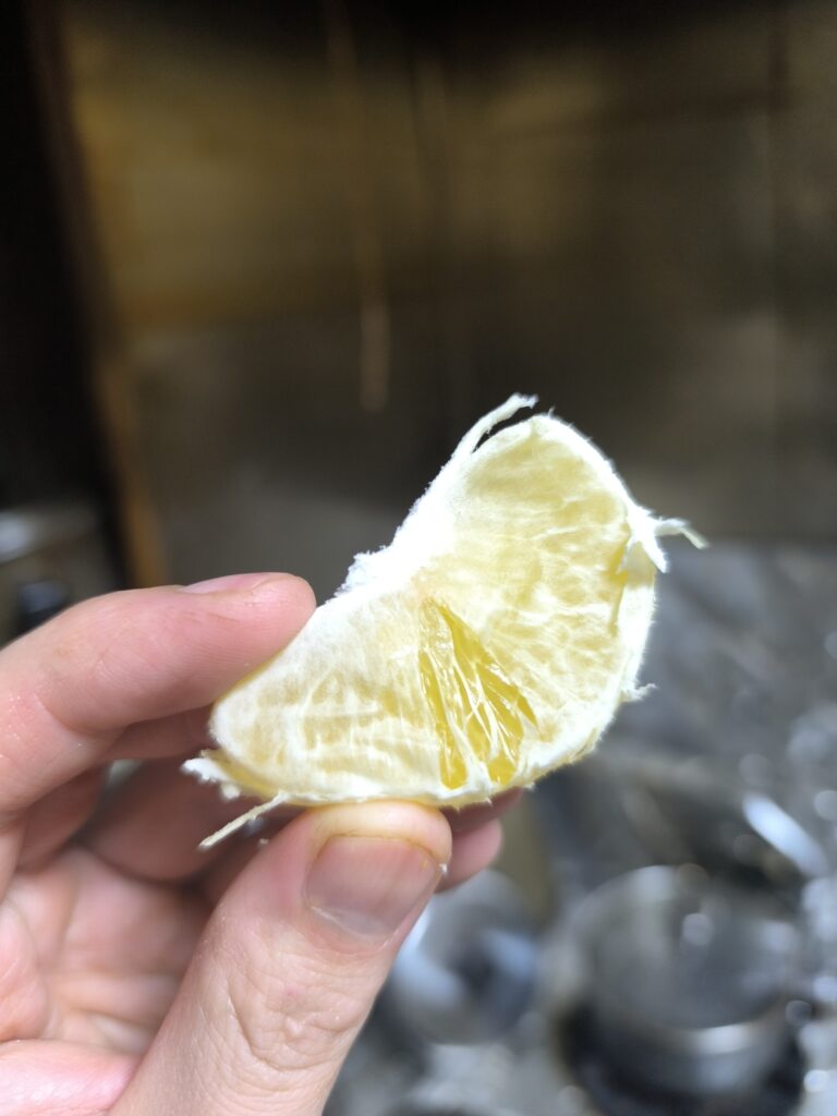 やや厚いがさほど気にならない瓤嚢膜、かなり引き締まったプリプリの砂瓤。酸味はほとんどなく甘味が強い。柑橘香は強くなく、リナロールの甘い香りがシトラールのレモン風味を纏い、後味にかすかにγテルピネンのシャープな柑橘香が香る。