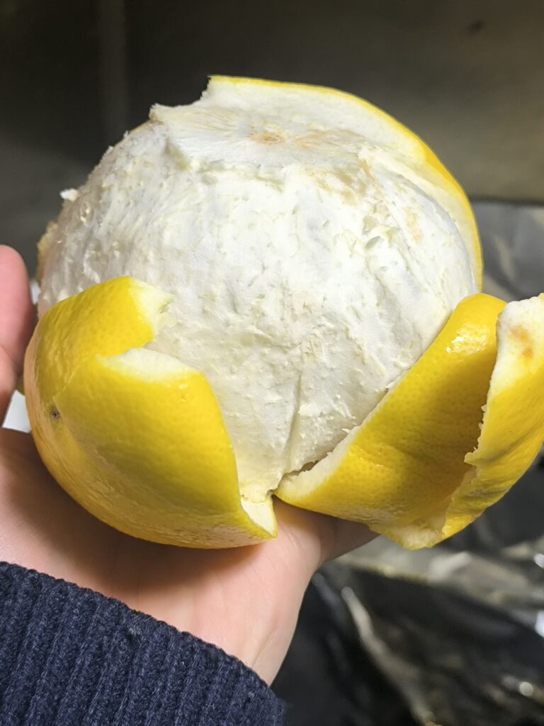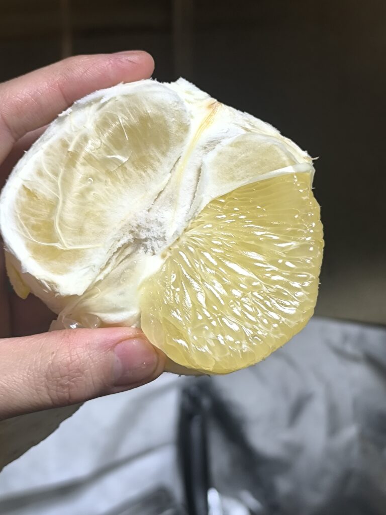 アルベド(白皮)はポメロより薄く、スウィーティーより歩留まりが良い。剥きやすいのでこの手の柑橘が好きな人には嬉しい品種。