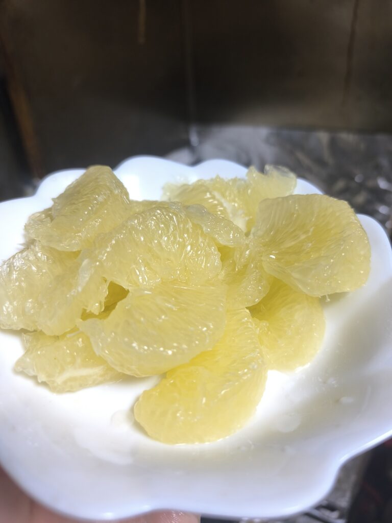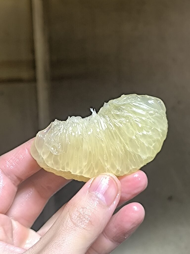 グレープフルーツよりやや後半の甘い香りが強い。ただ全体的にはグレープフルーツの風味がありポメロの様な食感の柑橘といったところ。