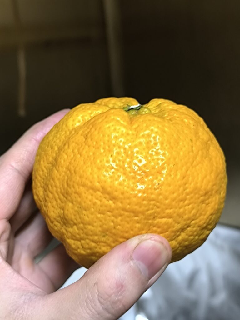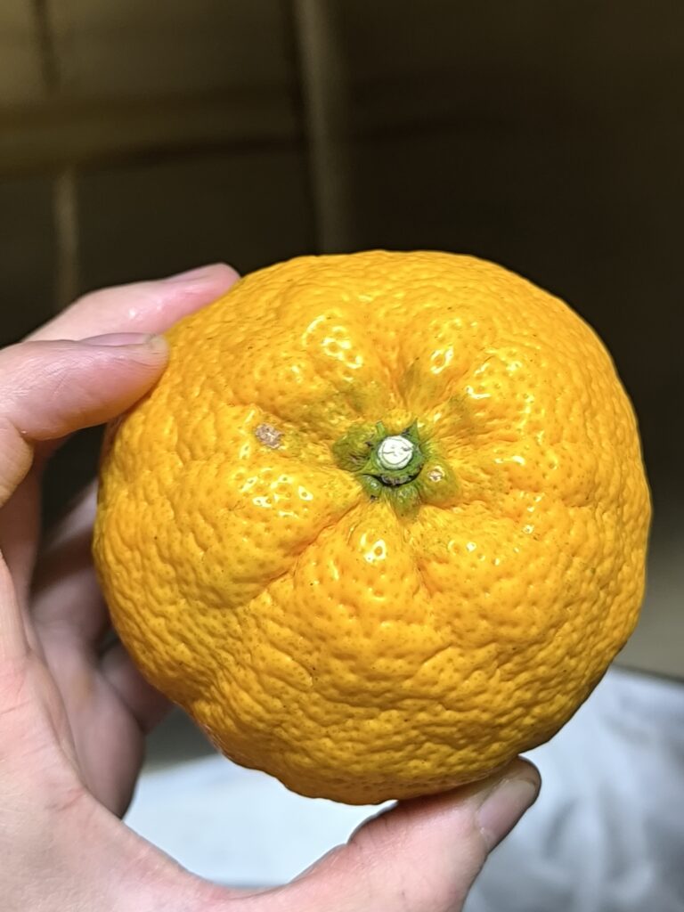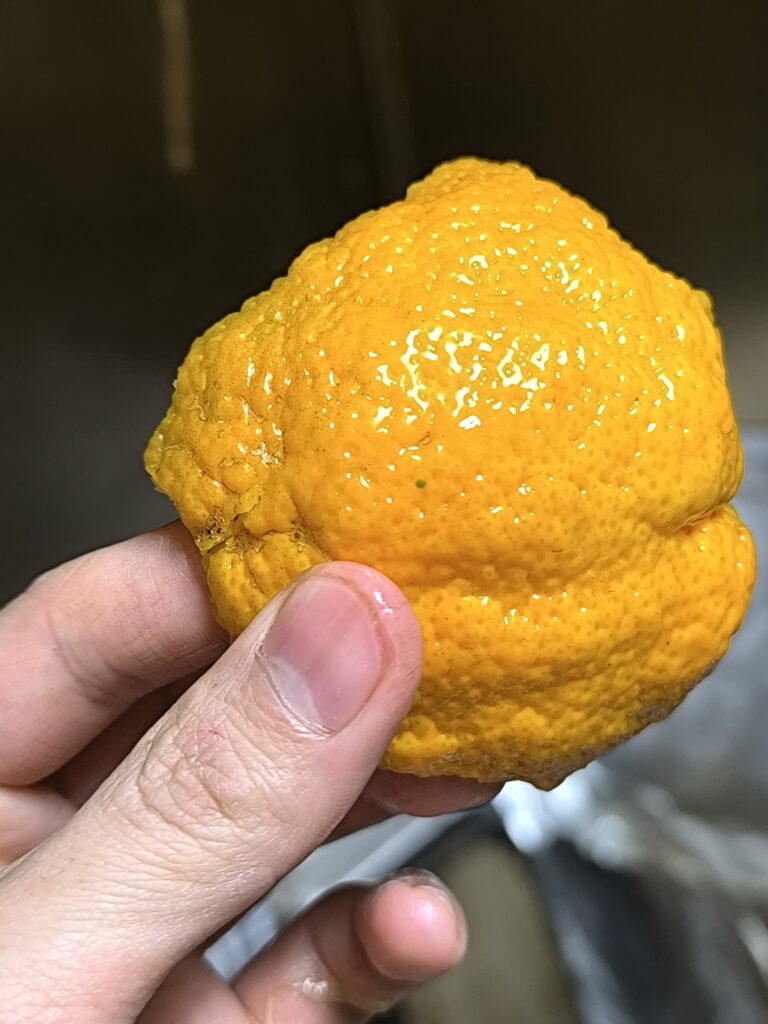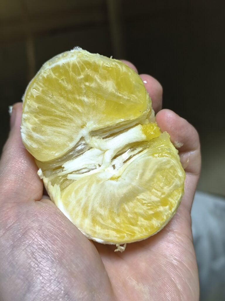 意外にも薄い瓤嚢膜は温州ミカンと同じでクネンボ由来か、砂瓤のやわらかで潰れやすい感じと薄黄色の色合いはユズに近い。