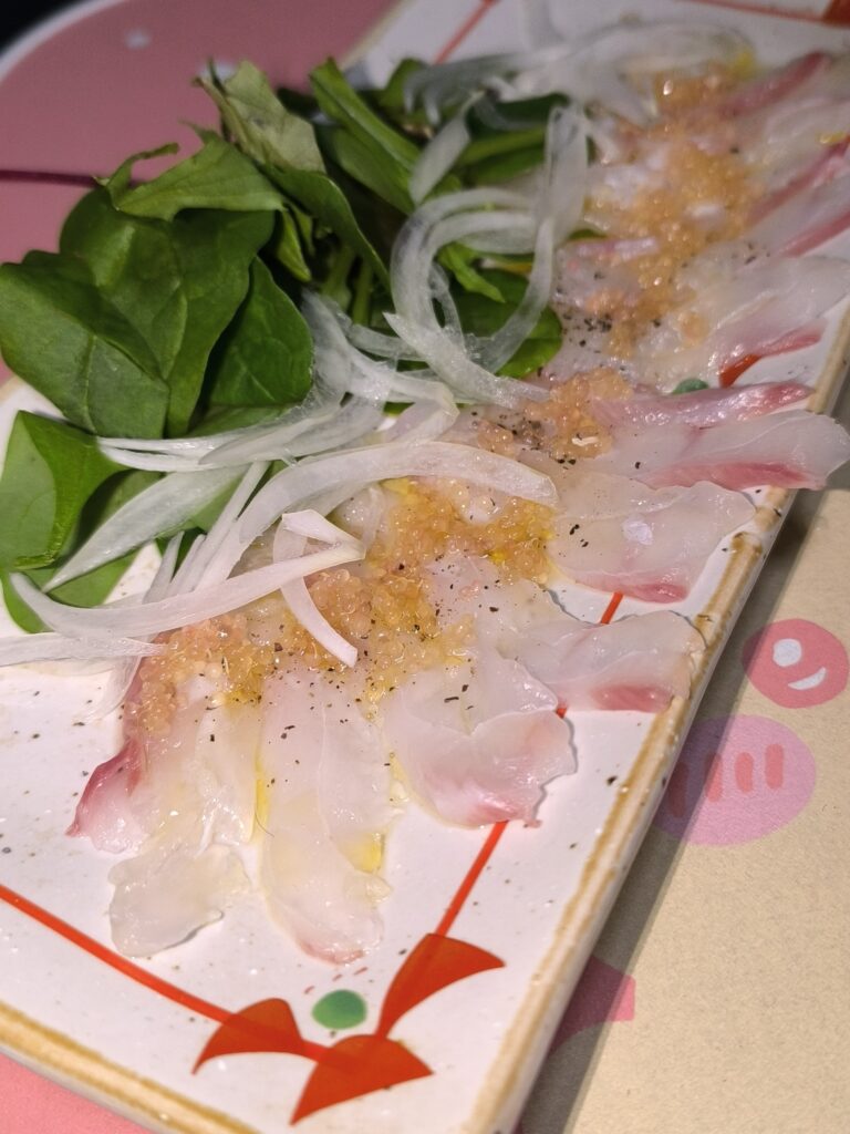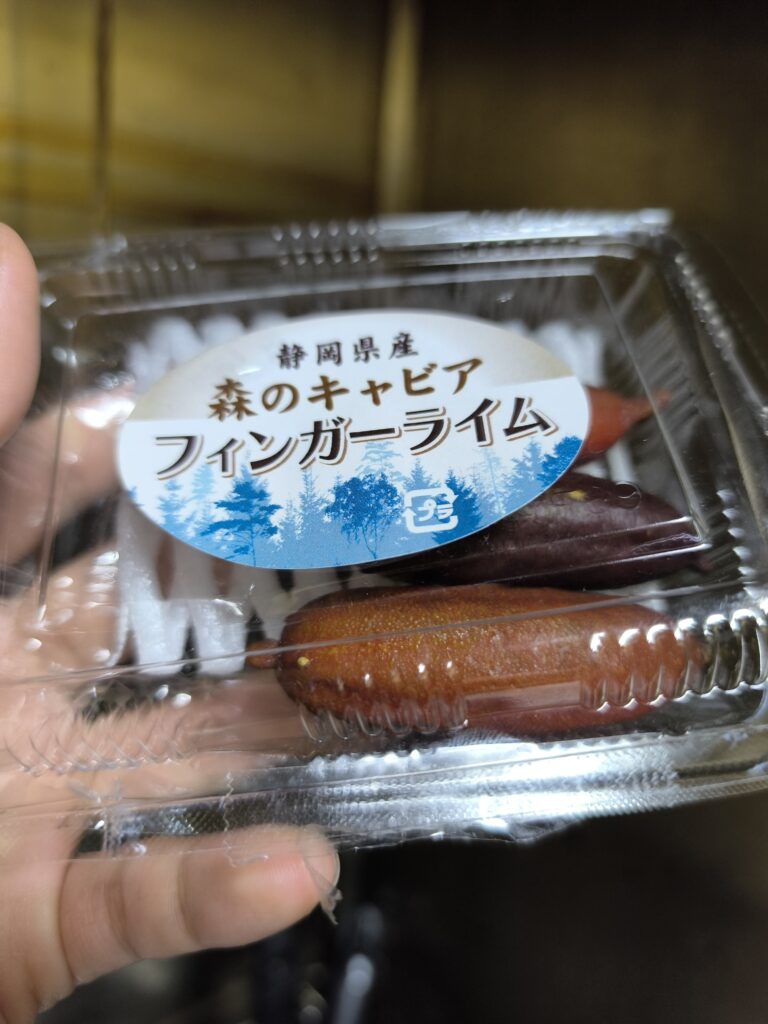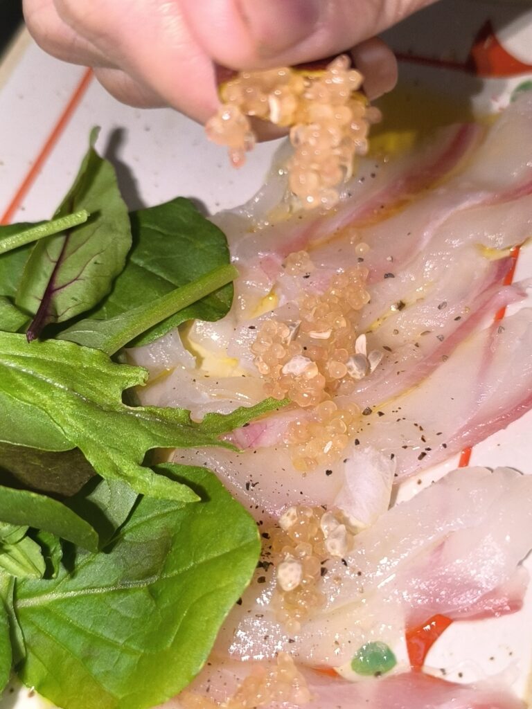 フィンガーライムはキャビアのようなねっとり食感ではなく数の子のような強固な粒感であるため、酸味を活かしてカルパッチョに使うのが良いと思う。