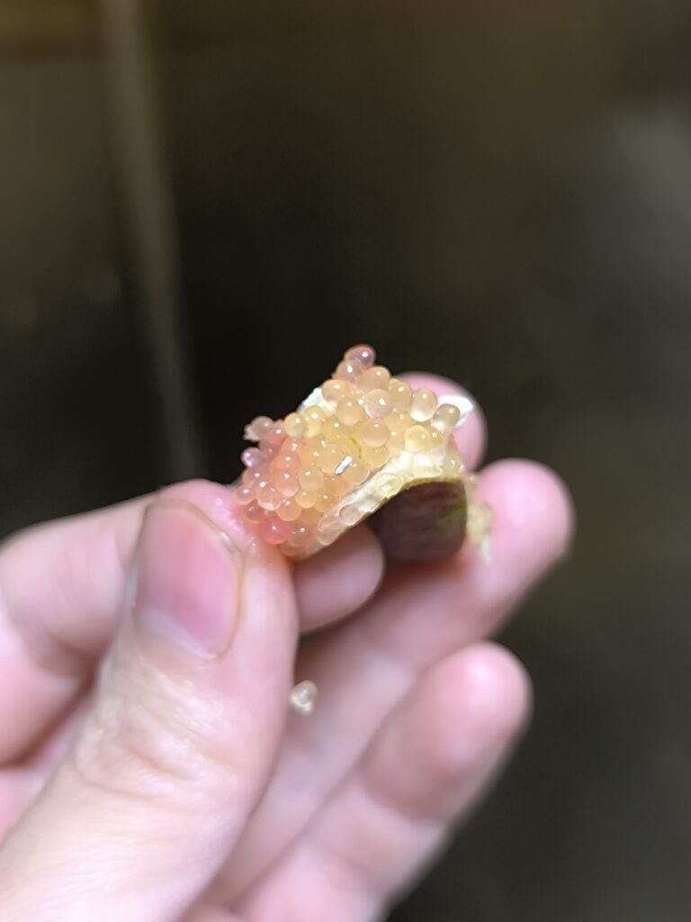 まず香るのはリモネンとシトラールによるオレンジの香り、食感はキャビアというより数の子に近い強い弾力。