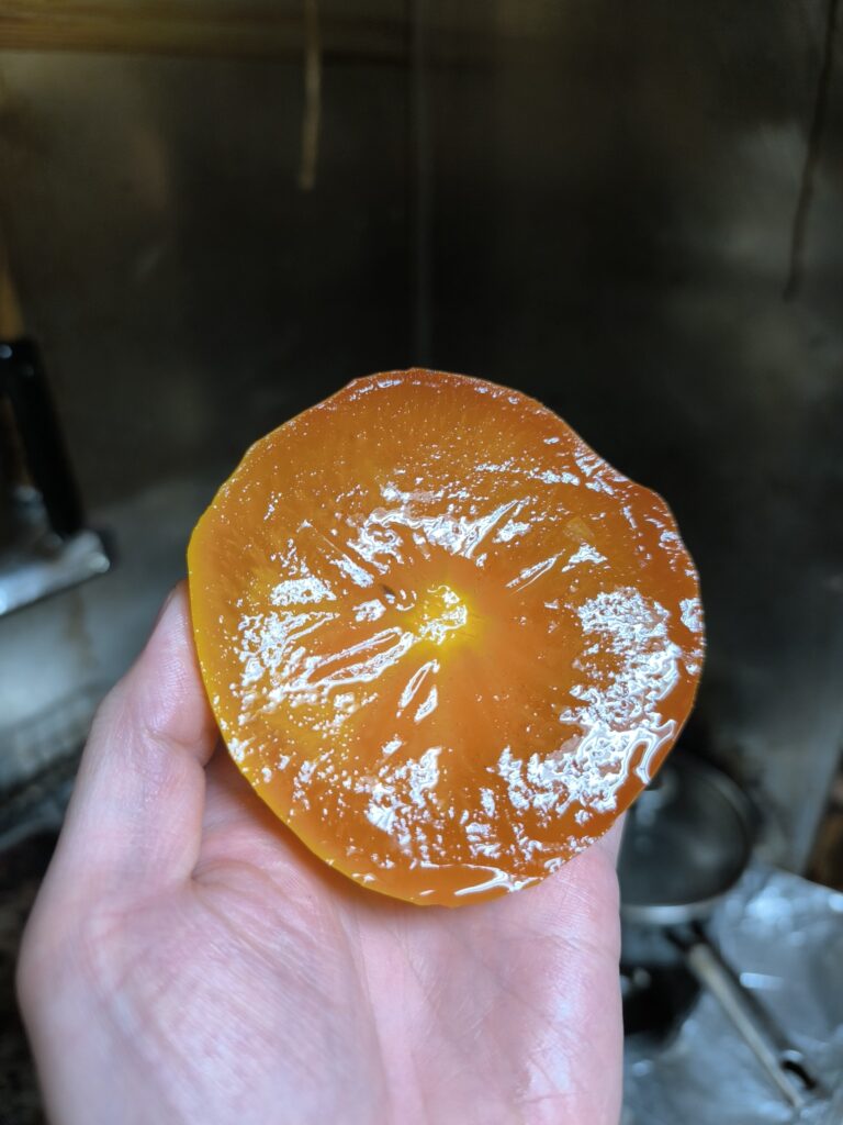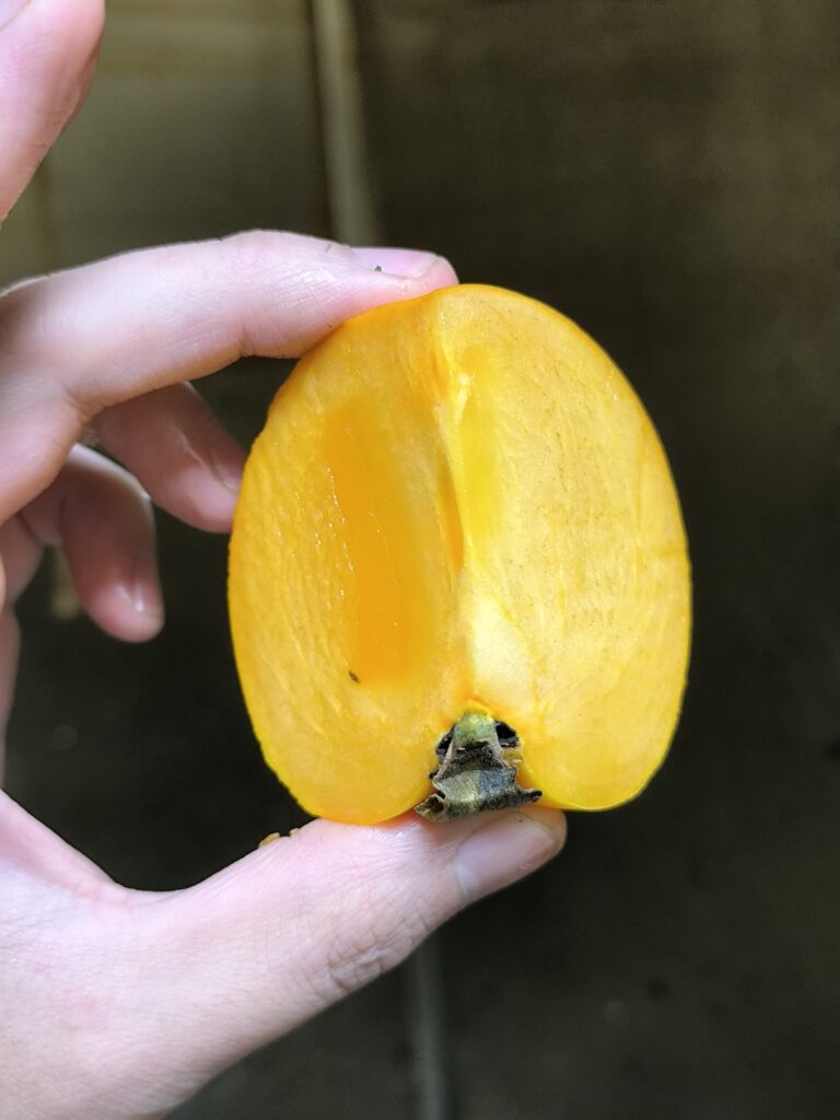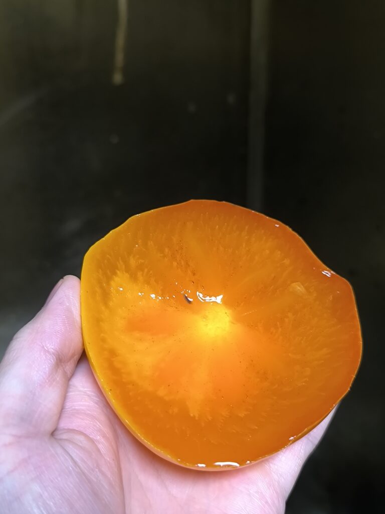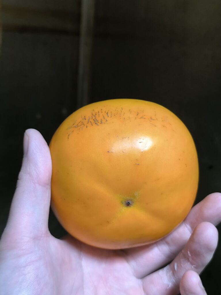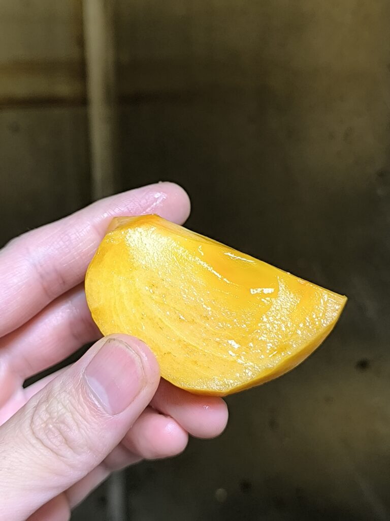 今回は指の跡がつくくらいの追熟具合、簡単に言えばプヨプヨ太秋である。色はアンポ柿のようにやや半透明の濃いオレンジ色。