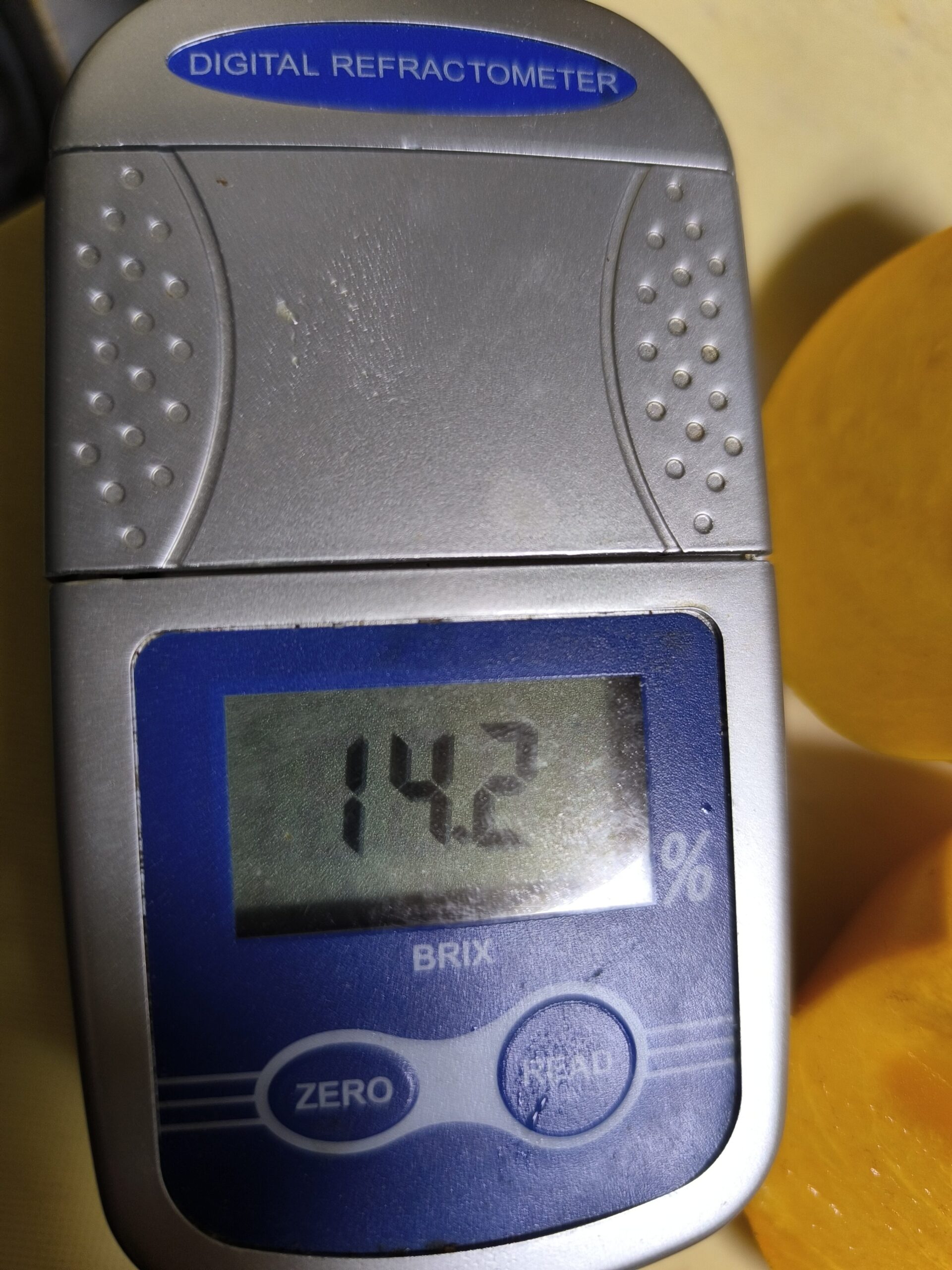 糖度は14前後、青いうちから甘い完全甘柿であり、かなり青いものでも12%くらいの糖度はあったりする。