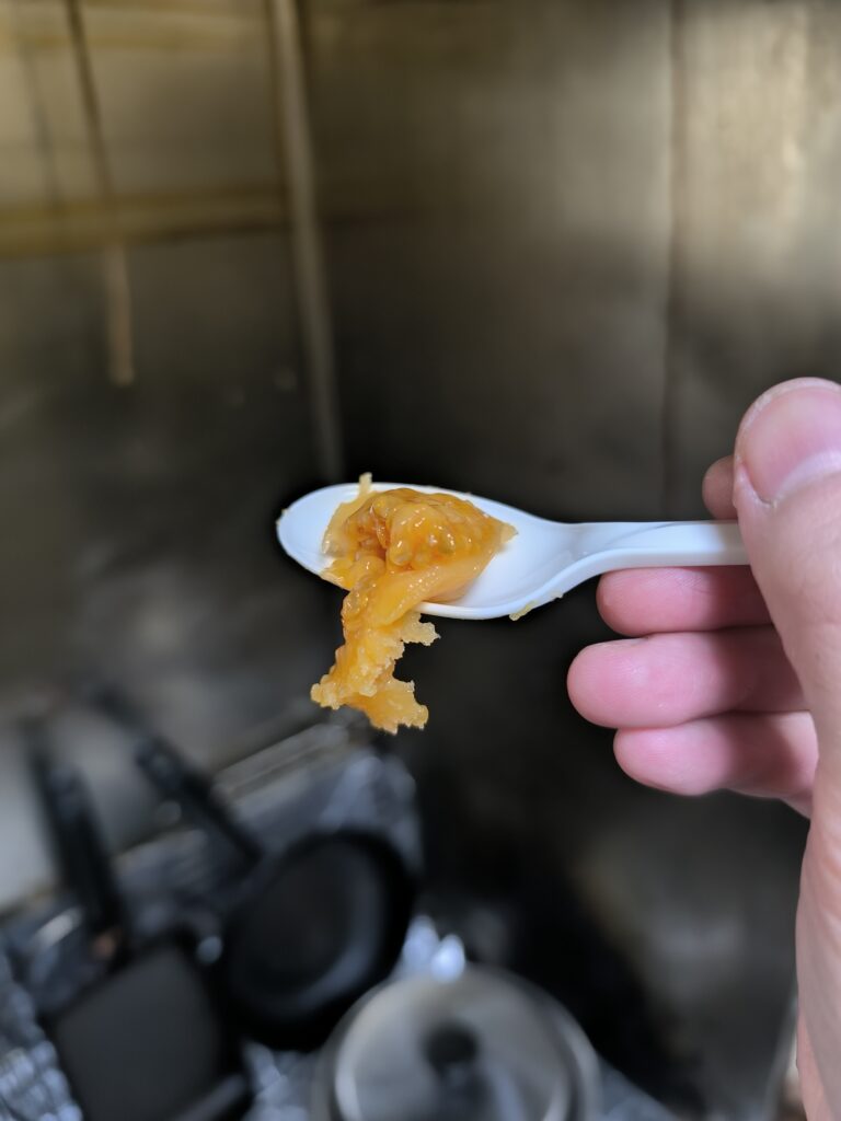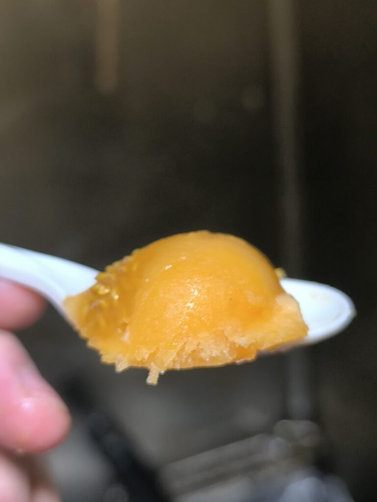 まず酪酸エチルのパイナップルのような香りを感じ、果肉の粒感ある滑らかなバナナのような食感、そしてほのかな甘味とトマトに近いフラネオールの甘い香りが乗りグルタミン酸の旨味を感じる。胎座のゼリー部にはパッションフルーツのような嫌味の無い酸味があり、後味にはトマトと同様にヘキサナールの青い香りがわずかに混じる。