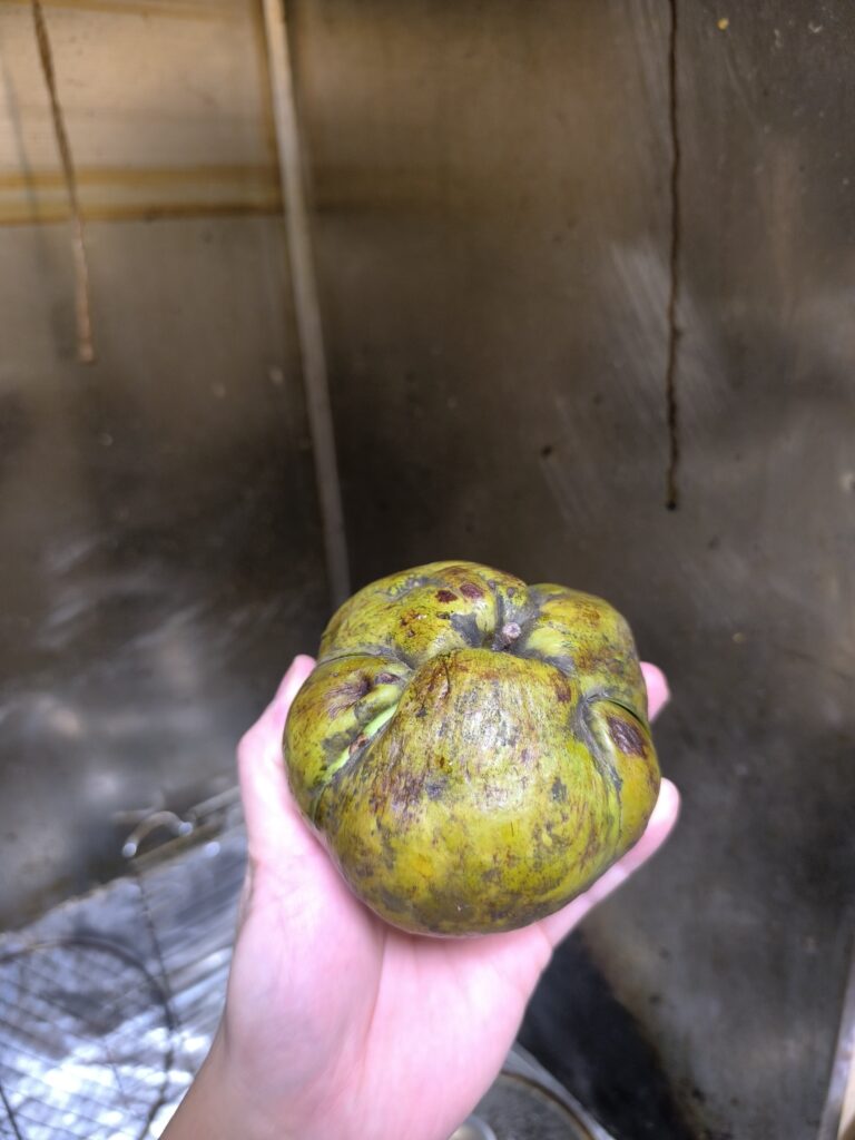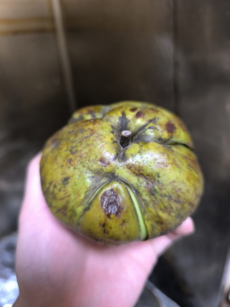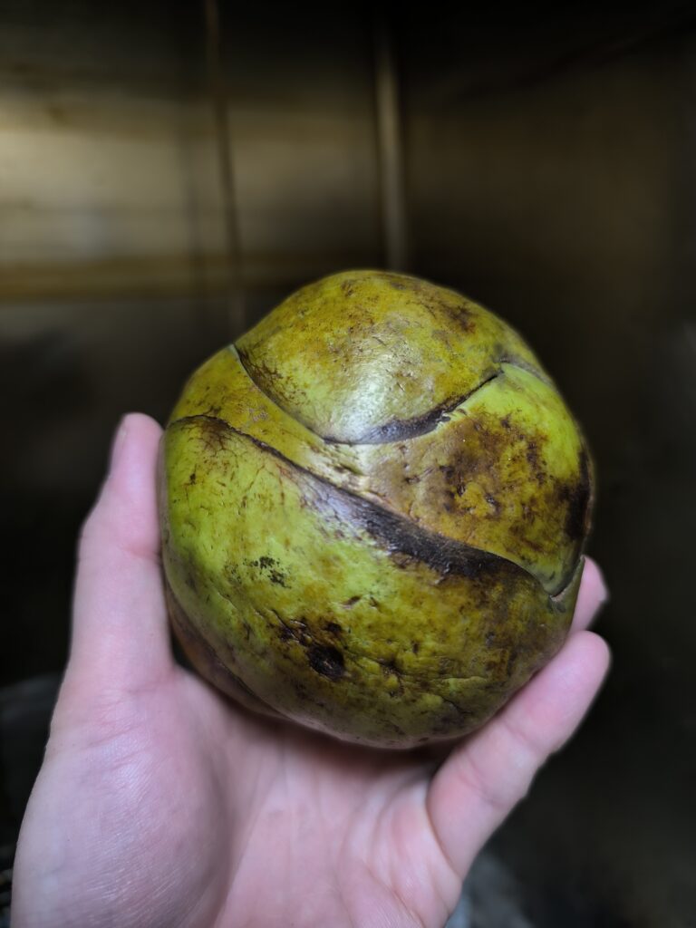 エレファントアップルは果物なのか野菜なのかよくわからない見た目だが、受粉して結実しなければこのような果実様の見た目には育たないだろうからフルーツということにしておく。