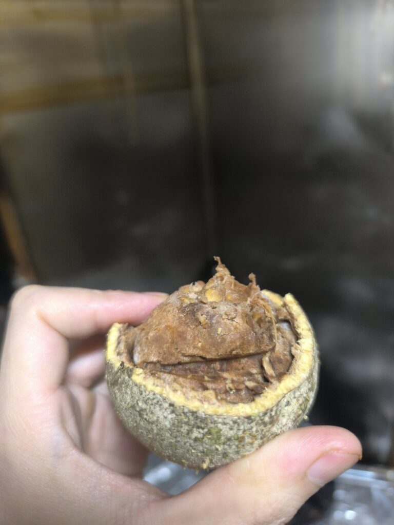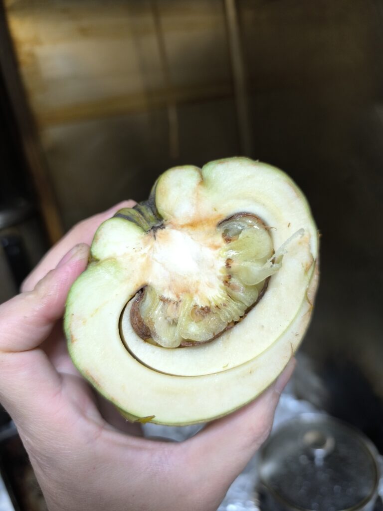 エレファントアップルの味は簡単に言えば繊維質でドリアンの香りがする繊維質な柔らかい繊維質なレンコンかな。