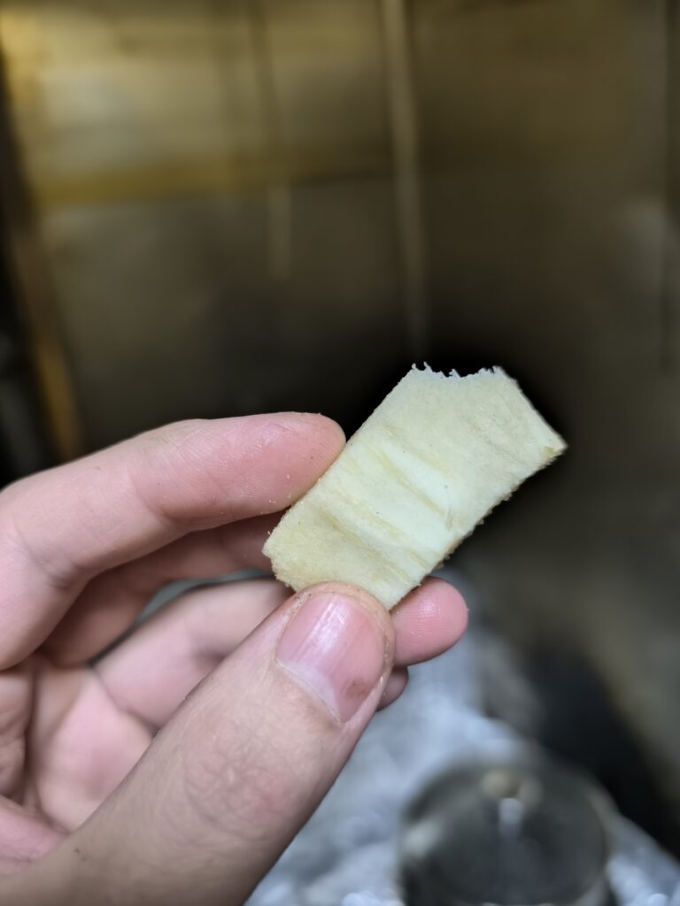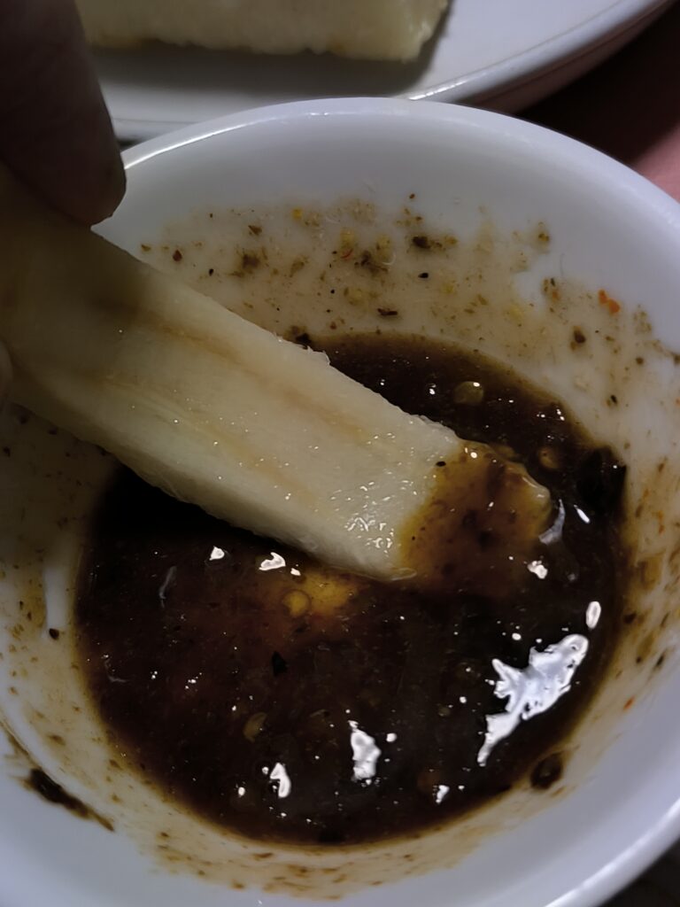 食感はレンコンのようなぬめりと繊維感があるがもっと柔らかい。まるでサトイモの先端部分のような食感。しかしモノによりサトウキビのような強い繊維が混じるため、硬いものはまるで木をかじったかのような繊維が口に残る。