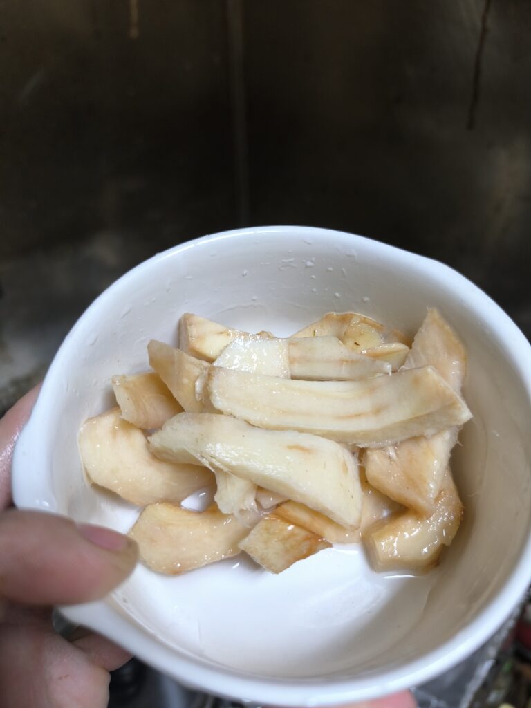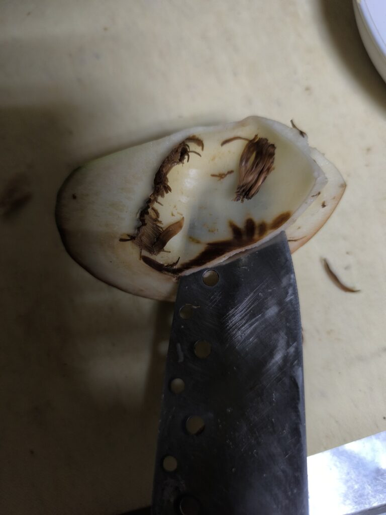 カーブしているためかなり剥きづらいし、薄く剥きすぎると強い繊維が残る。