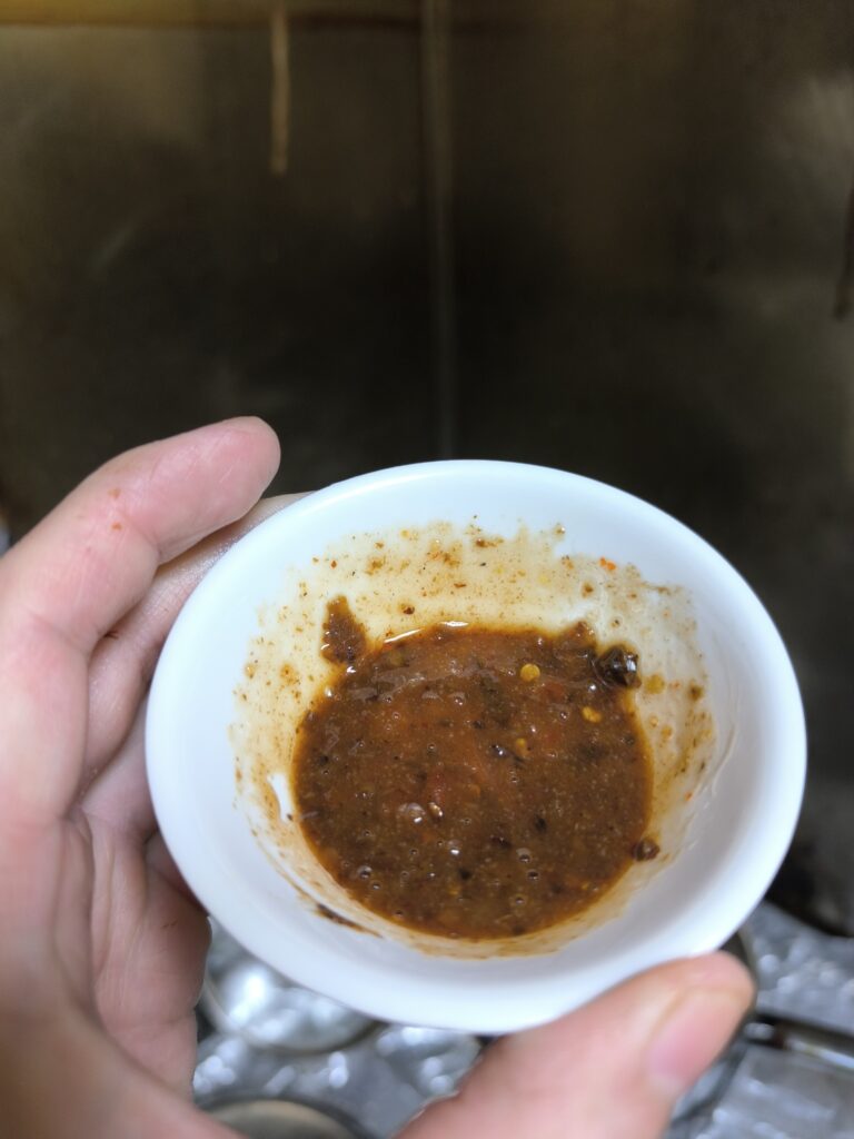 ソースで食べるために、ミャンマーの発酵エビにトウガラシぶち込んで味噌にしたようなンガピというペーストと、スイートチリソースを混ぜたソースを作った。