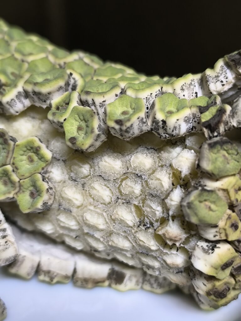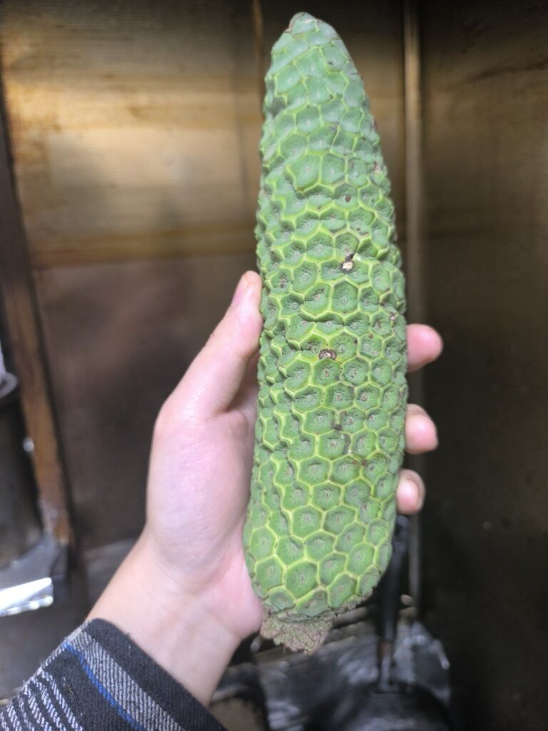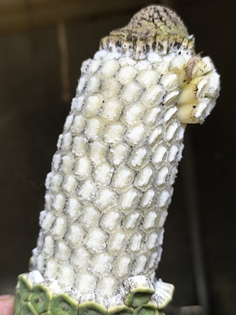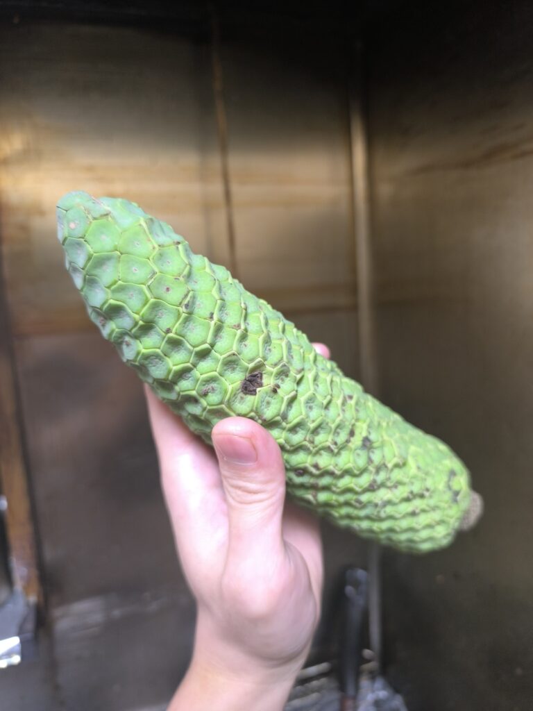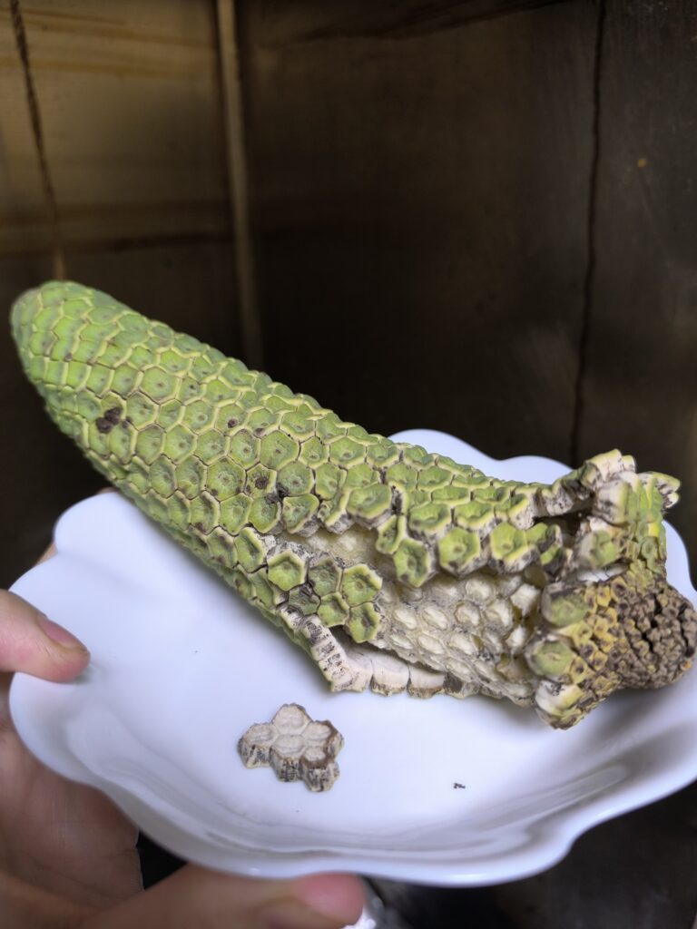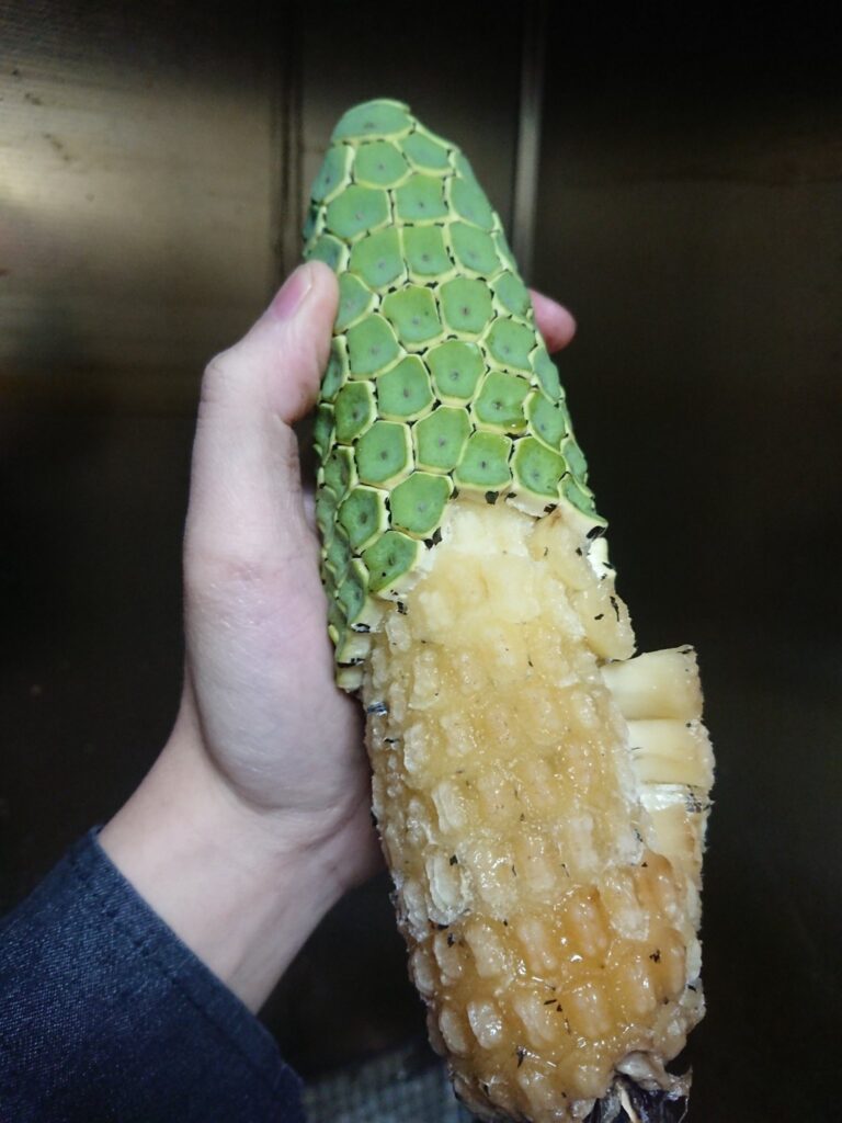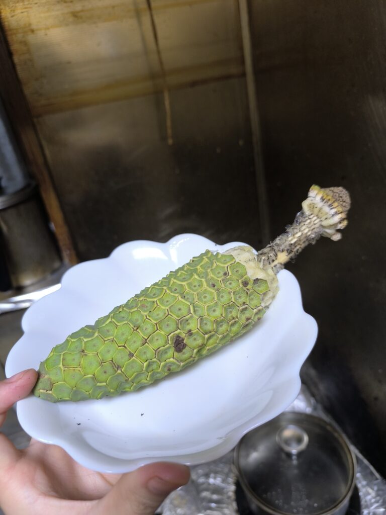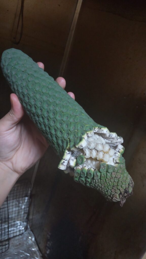 そんな伝説の葉っぱを持つモンステラ、果実も幻獣級でまるでドラゴンの尾のような外見をしている。