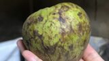 果皮は根元から爆裂し、剥がれだすが、果皮がまだ浮いていない部分の果肉をかじってしまうと