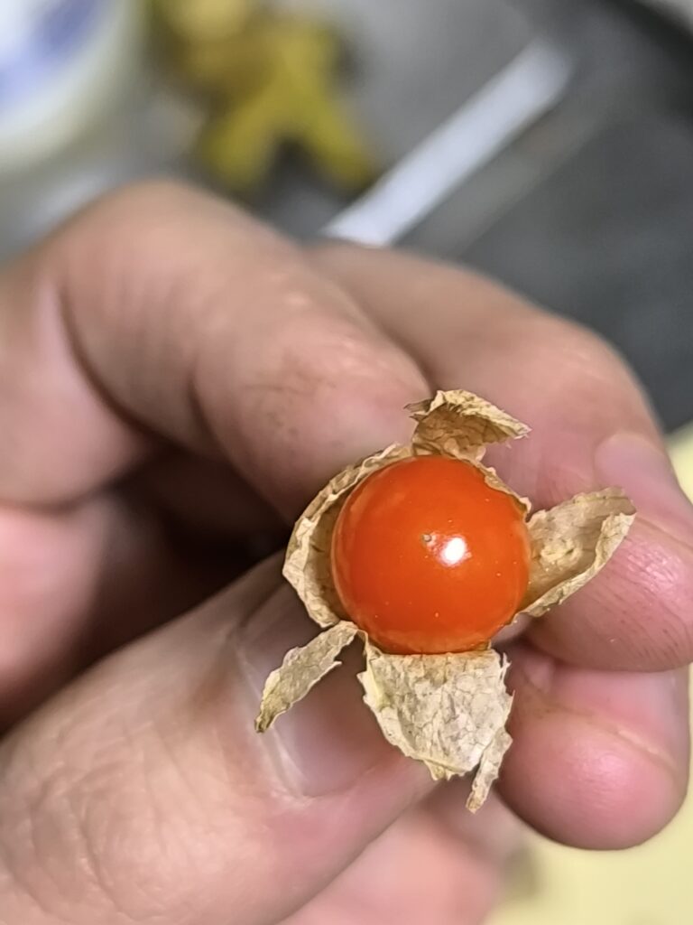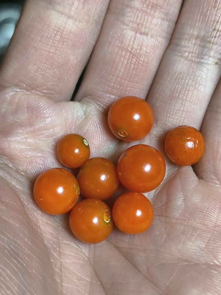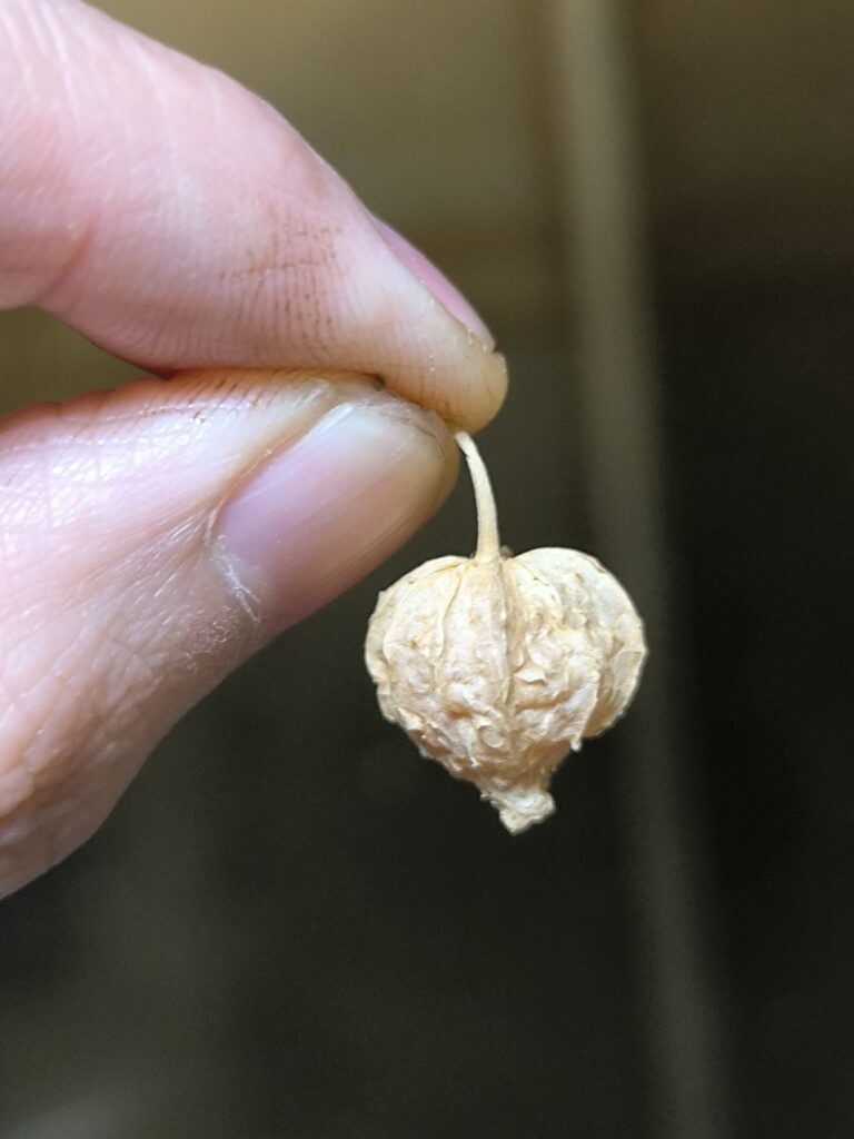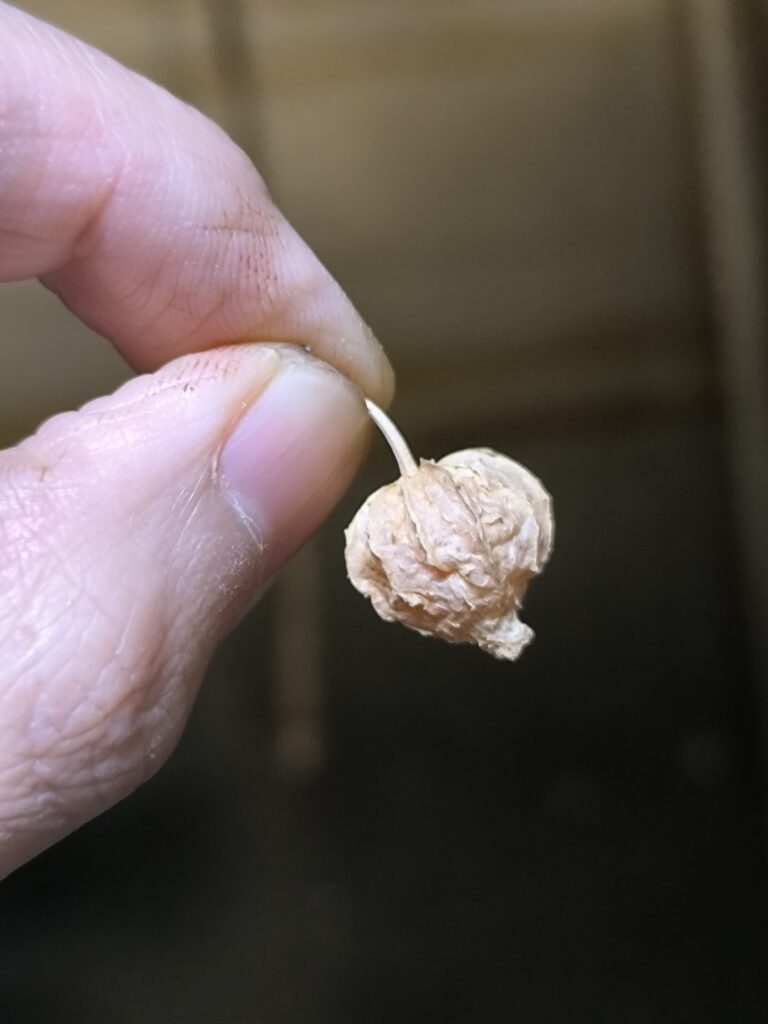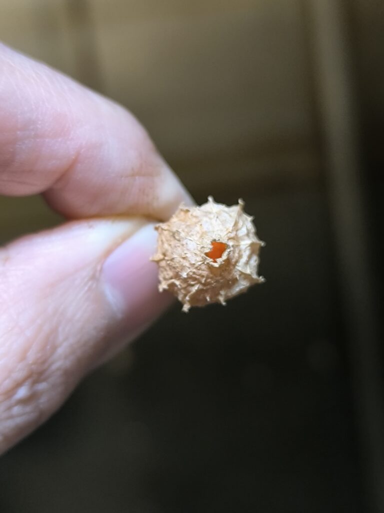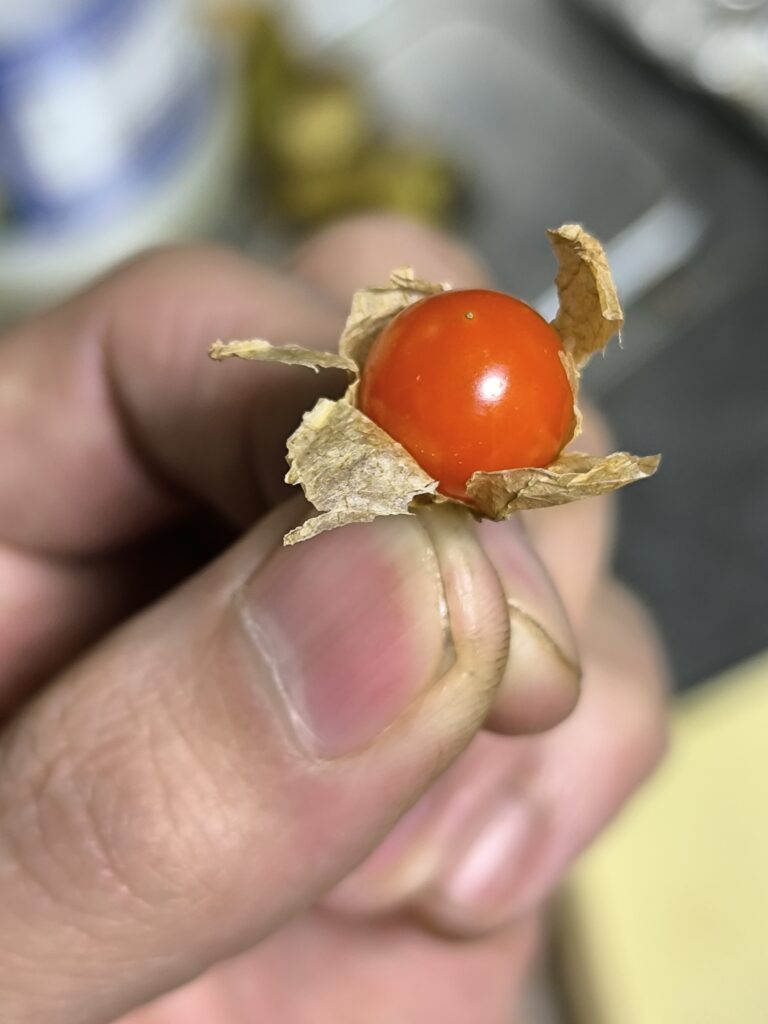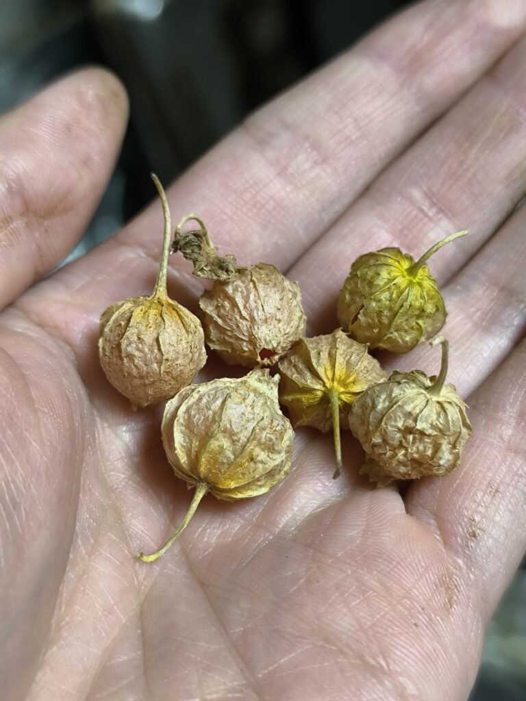 普通のホオズキ類と異なり袋に弱いトゲがあり、他のナス科と同様に陸貝類からの食害を減らすための機能がある気がする。
