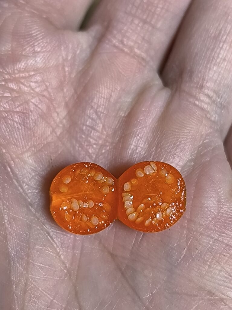 かすかにチャコニンの様な鉄を噛んだような酸味と、後味に青葉アルデヒドのトマトのゼリー部やイヌホオズキにあるような弱い青臭さ、低量のソラニンなのか未熟トマトのピペリジン酸の様な苦味が果皮に残る。
