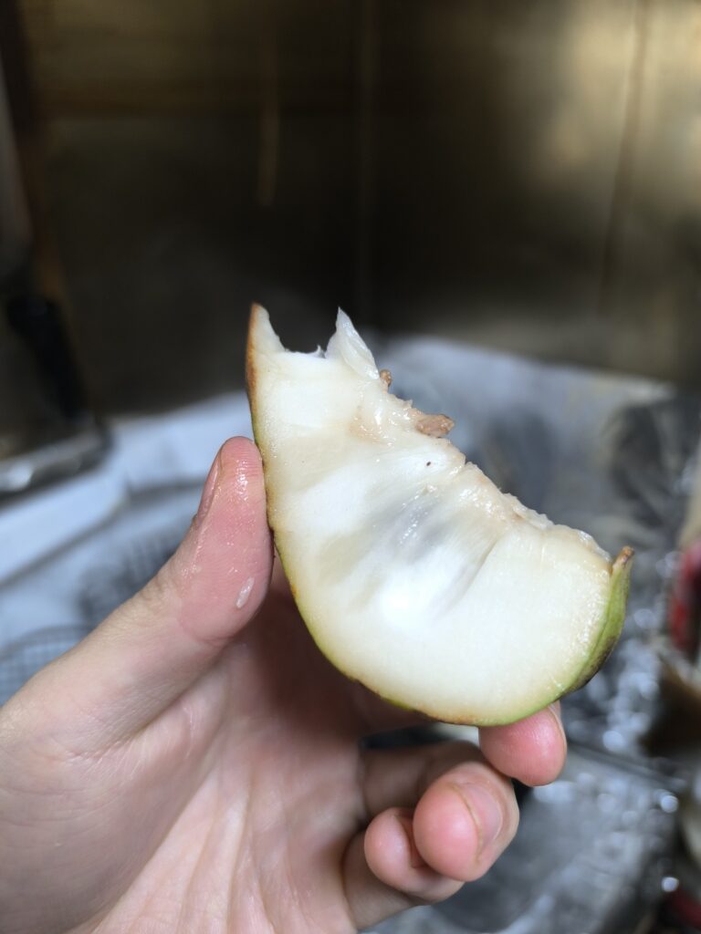 割ってからりんごにのせて3日、十分追熟が進んだので食べてみよう。
