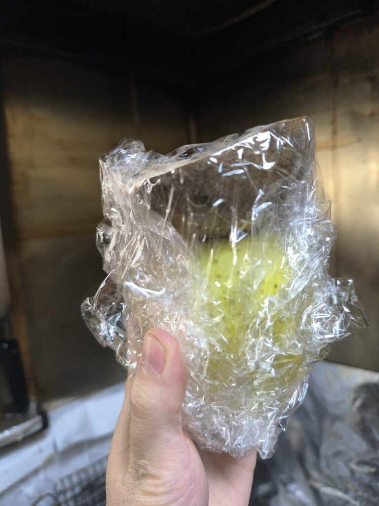 そう、リンゴである。基本的に追熟型のフルーツは割っても追熟が進むので、未熟だったらこの様にりんごにのせてラップして置いとけばリンゴが発するエチレンガスにより追熟する。