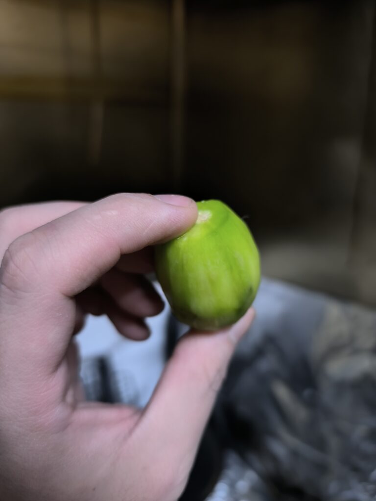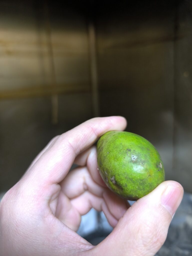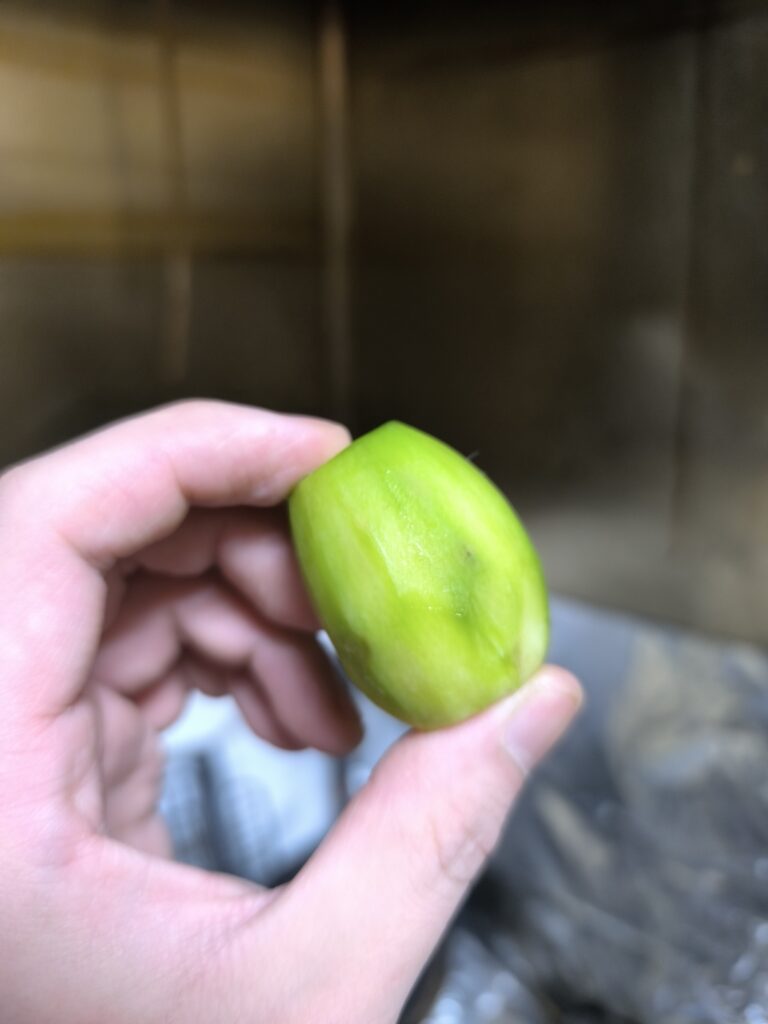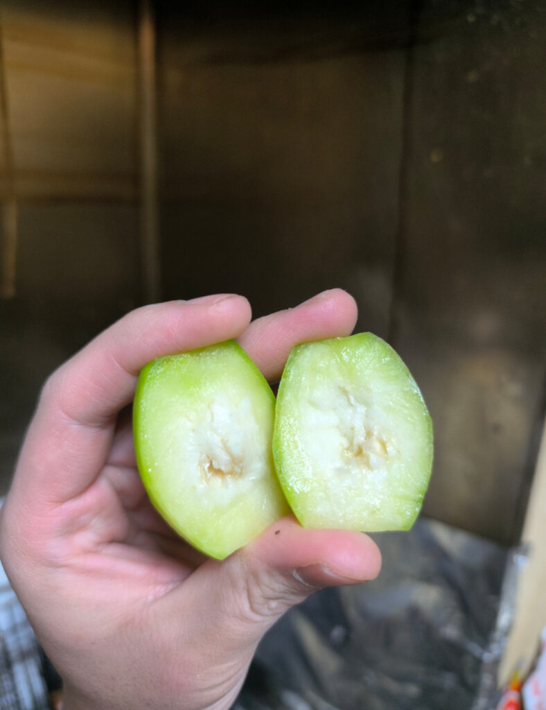 だいたい流通しているのは未熟果で、完熟果実は種の周りだけ甘味が強い。未熟果はそのまま食べるとカリッとしたカブの浅漬けのような食感と酸味がある。香りはヘキサナールの青さと果皮付近のミルセンによるローズマリーのような薬品香、そしてほのかにピラジン類によるだろうローストピスタチオのようなナッツ香が後味に残る。