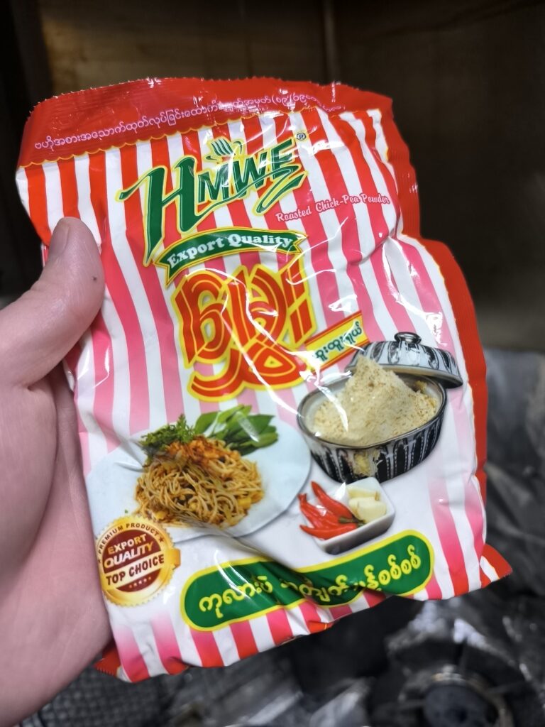 次にヒヨコ豆パウダーの加熱タイプを買ってくる。非加熱タイプは加熱しないと食べられず、ミャンマーのココナッツラーメンや豆腐の材料になる。