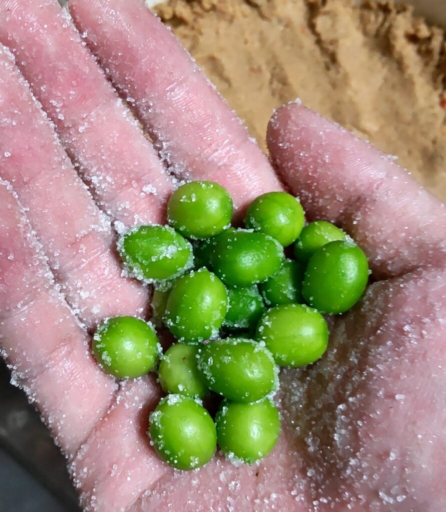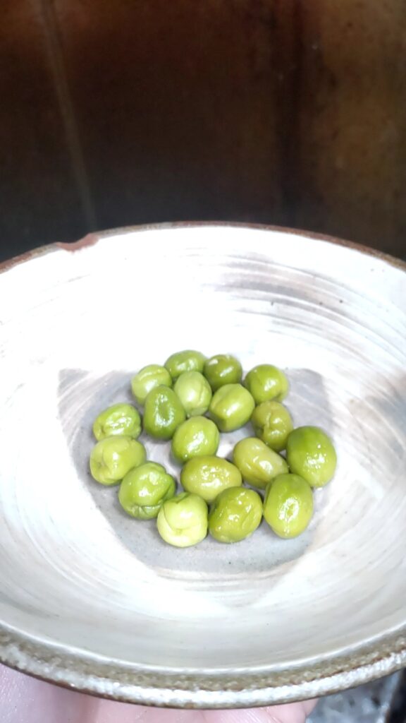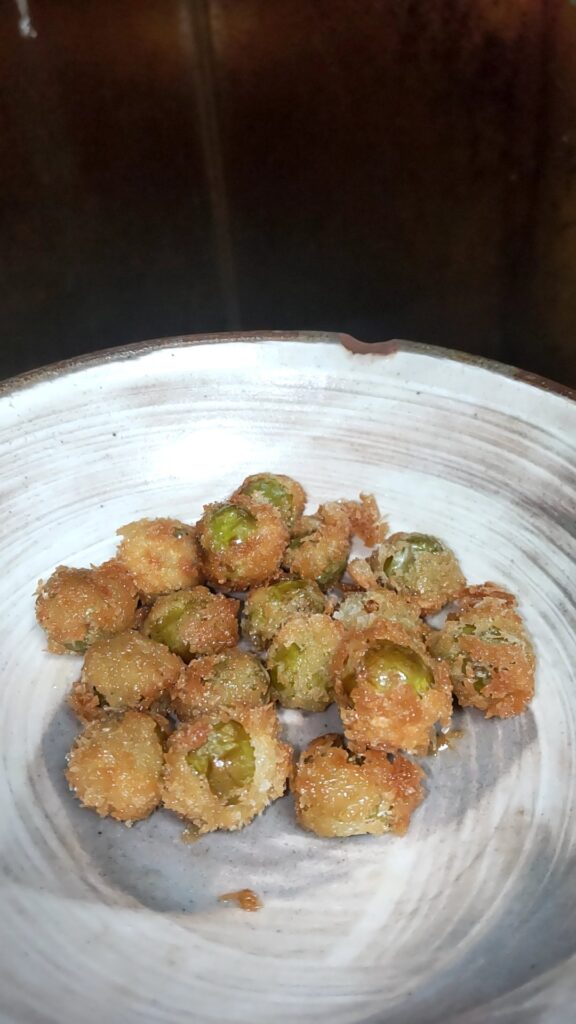 そしてそのスズメウリの糠漬けに小麦粉をまぶし、卵液にくぐらせ、パン粉をつけて油で揚げると見た目も味もまるでグリーンオリーブのフライの様な美味さになる。