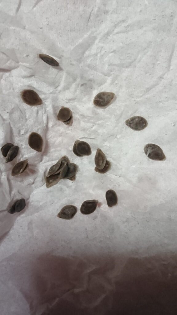 種子はミニチュアなキカラスウリのよう、平たく小さいが、沢山入っている。