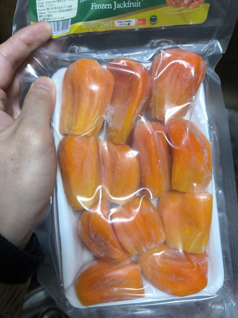 こんな感じで売っているので試してみては如何だろうか?ジャックフルーツは冷凍でも生でも食感は変わないので、むしろ追熟の必要がない分食べ頃で冷凍されてる冷凍品のがハズレは少ないかもしれない。