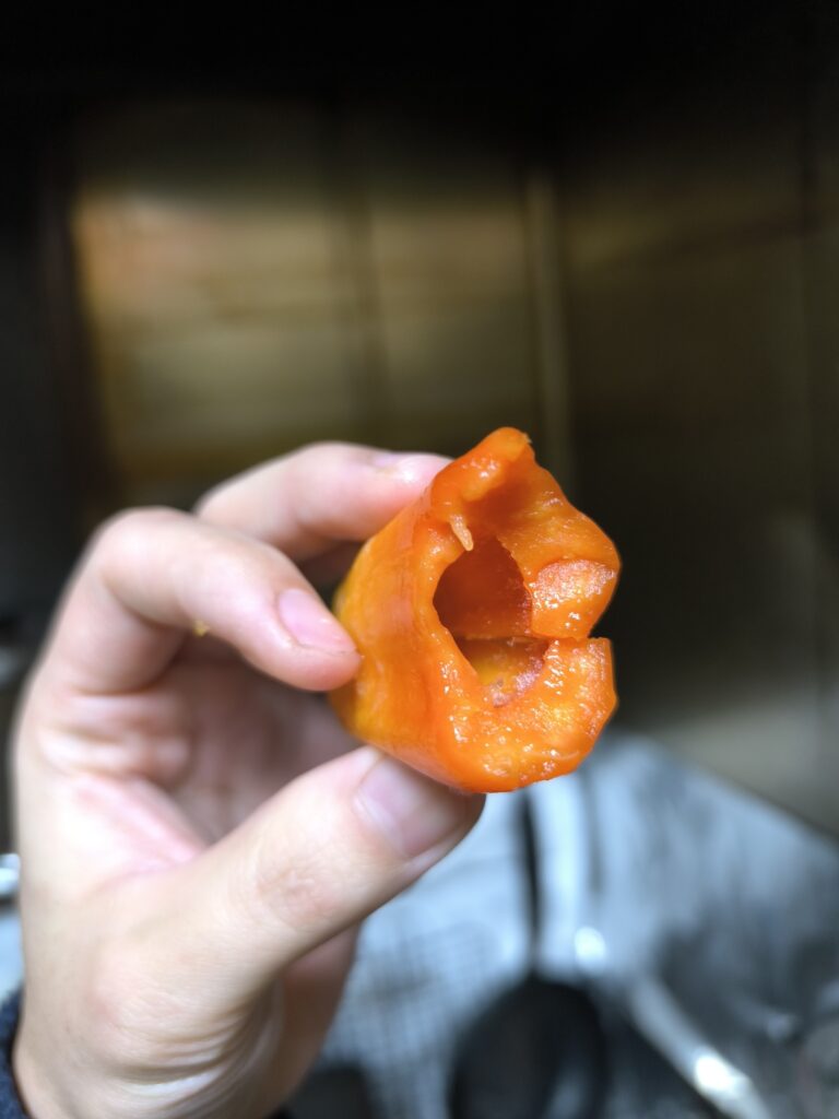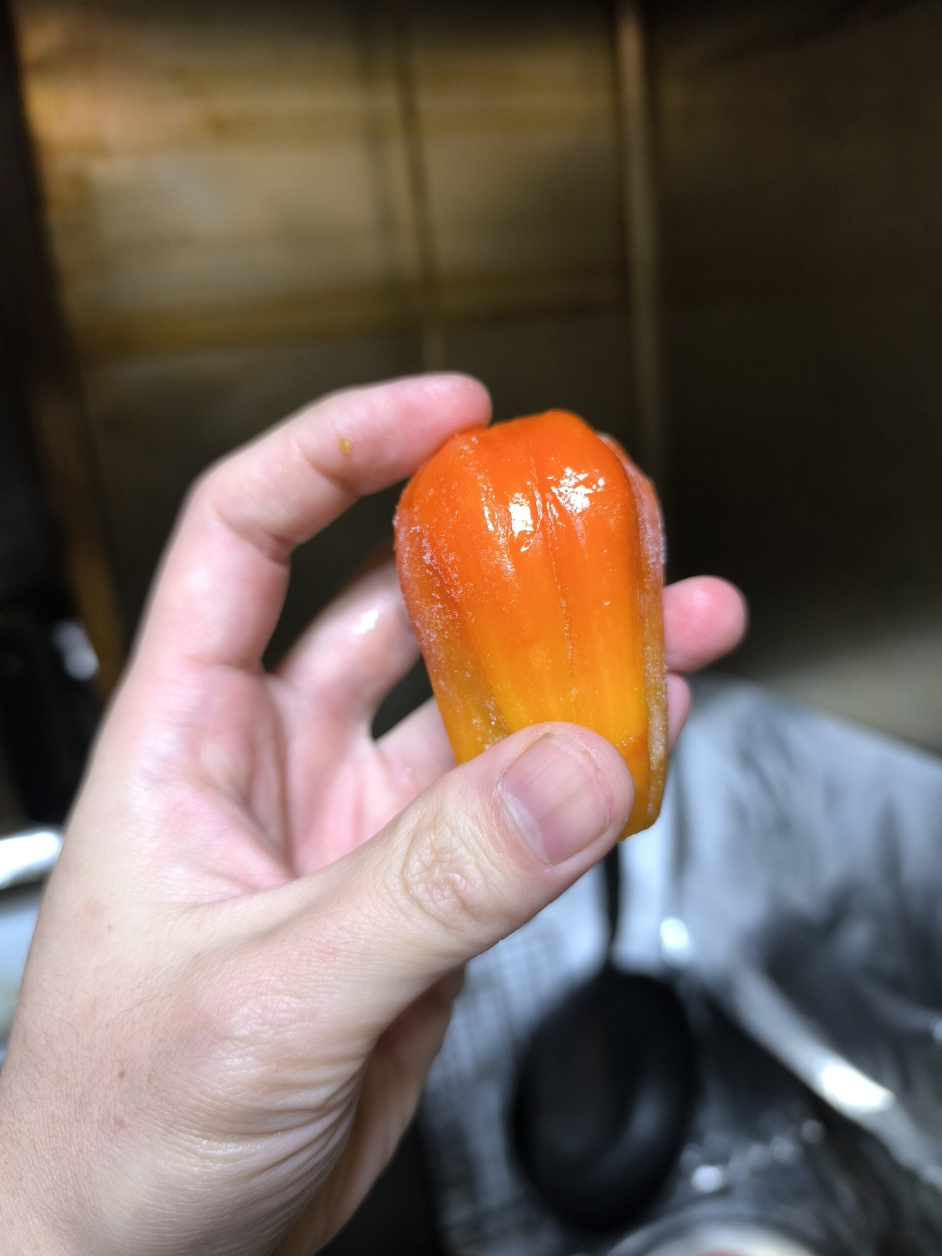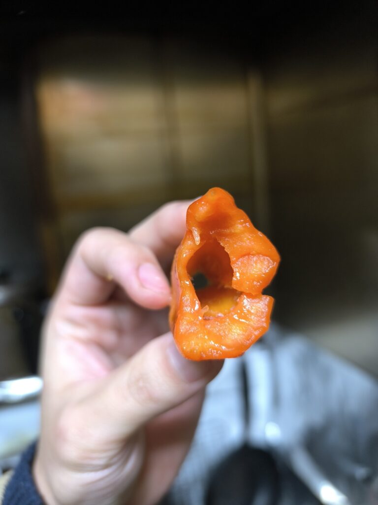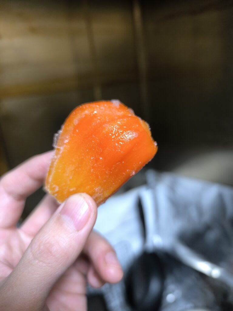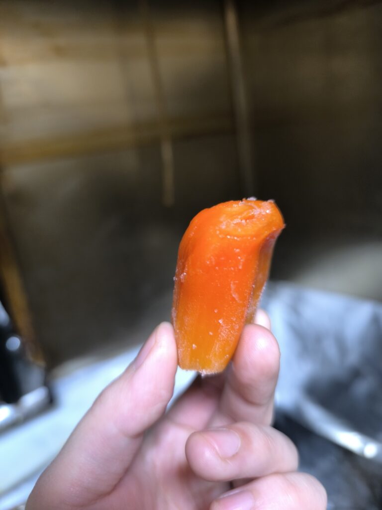 食感は湯葉の様なビニール質の表皮に茹でニンジンのような果肉。しかしジューシーで糖度の通り濃厚な甘さだ。