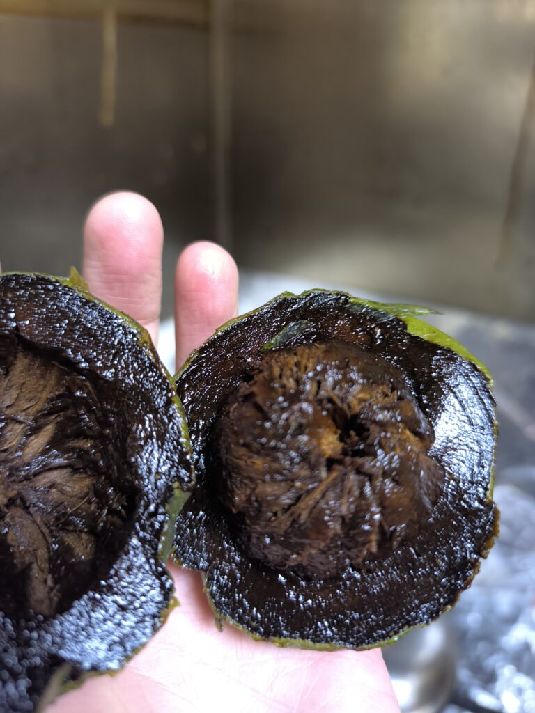 割ってみるとまさしくブラックなサポテ(木の実)だ。チョコレートプディングフルーツとも呼ばれるのもわかる。